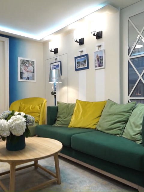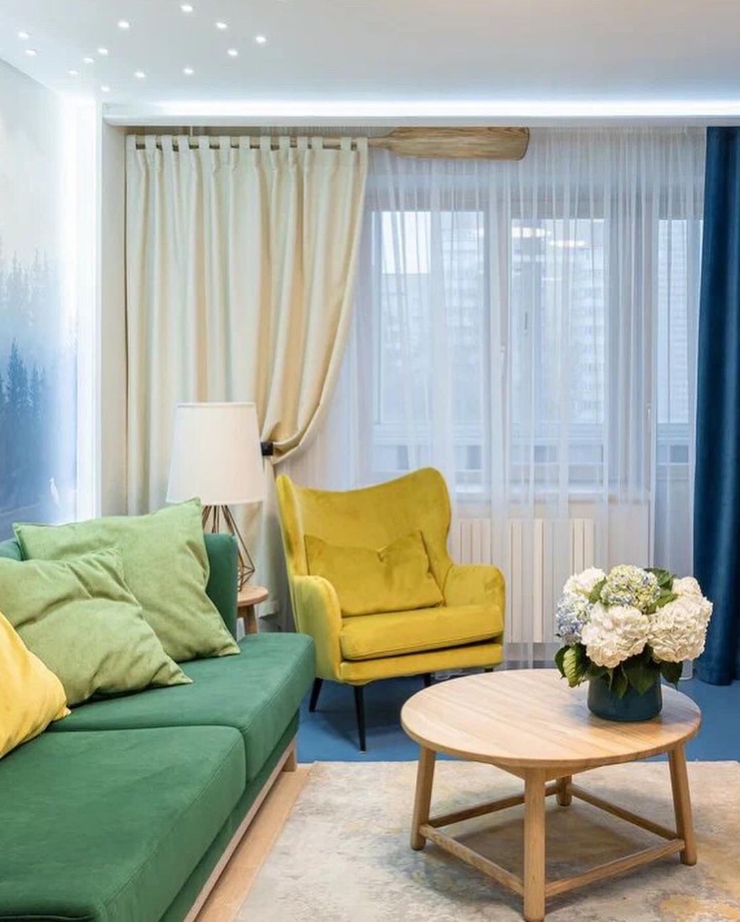 - Цветовая гамма гостиной выполнена в природных оттенках: глубокий синий цвет, похожий на цвет воды, и нежный кремовый, напоминающий утреннюю дымку над рекой, и насыщенный зеленый, и солнечный желтый.