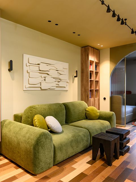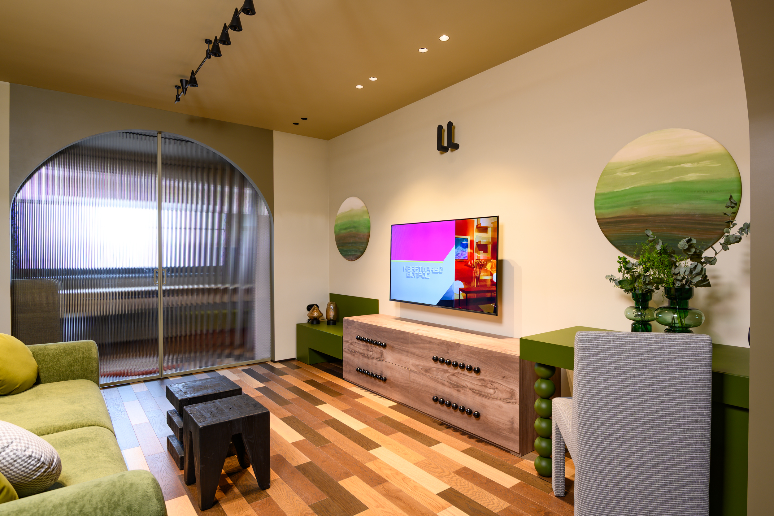 В проекте реализовано разделение 24‑метрового помещения на две функциональные зоны: гостиную и комнату подростка. Для обеспечения приватности установлена раздвижная перегородка «Meta» производства ульяновской фабрики «Терем».