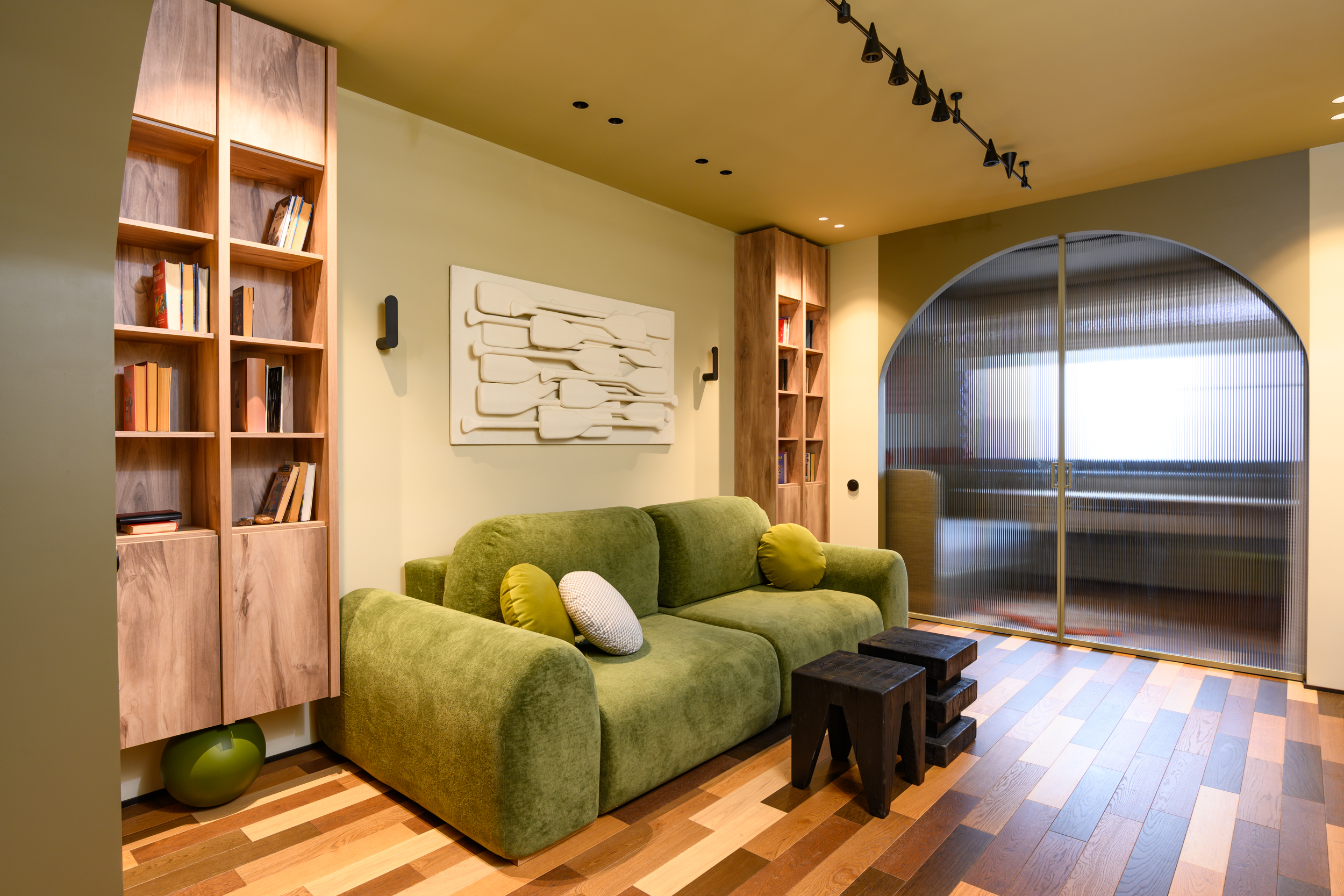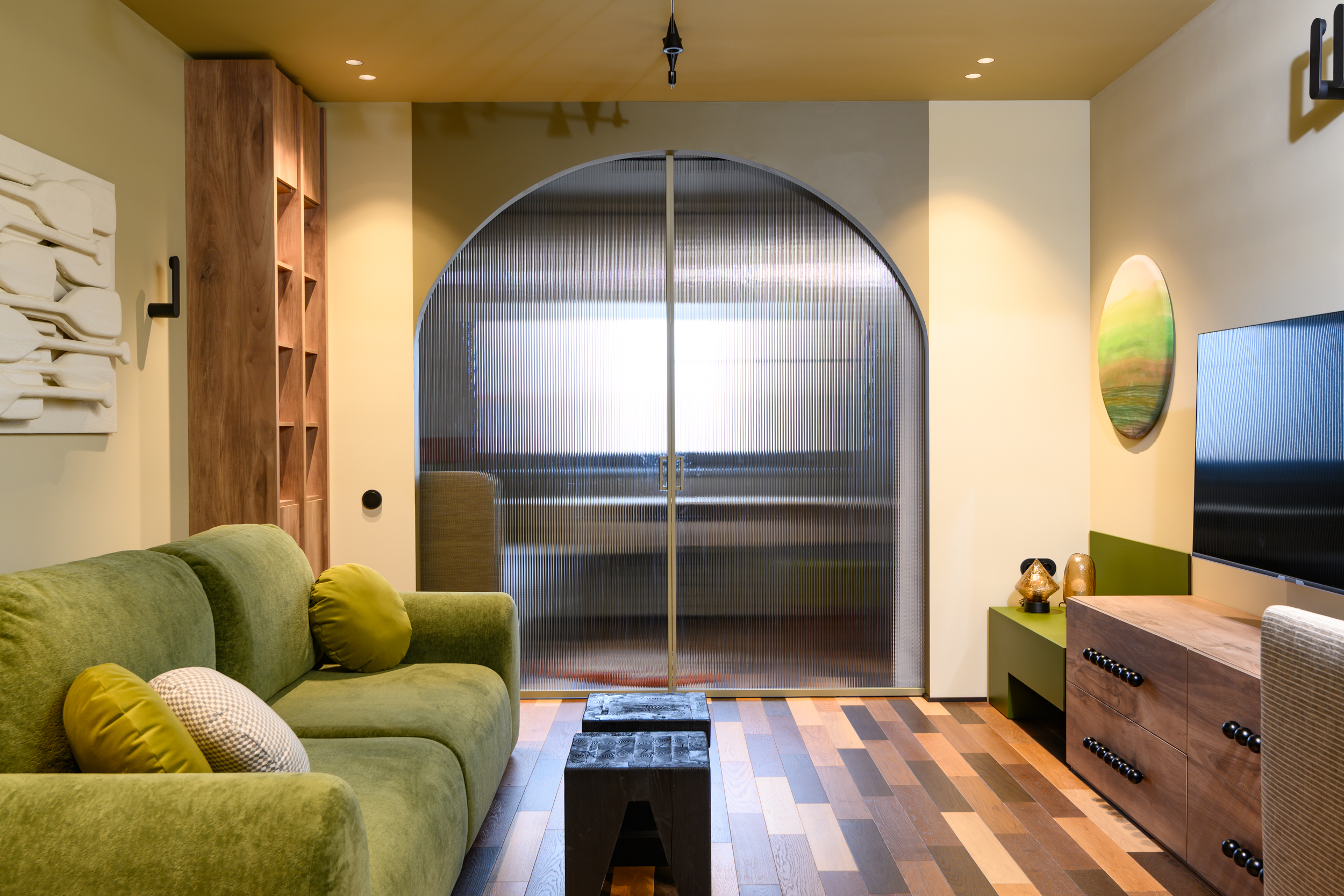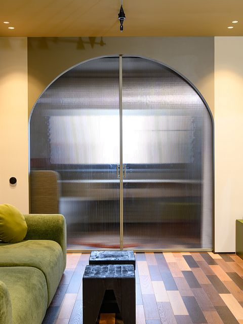 Перегородка создана по индивидуальному эскизу дизайнера проекта. Алюминиевая конструкция сочетает в себе современные технологические решения и эстетическую привлекательность: рифлёное стекло придаёт интерьеру динамичность и изысканность, а продуманная система зонирования обеспечивает функциональность пространства.
