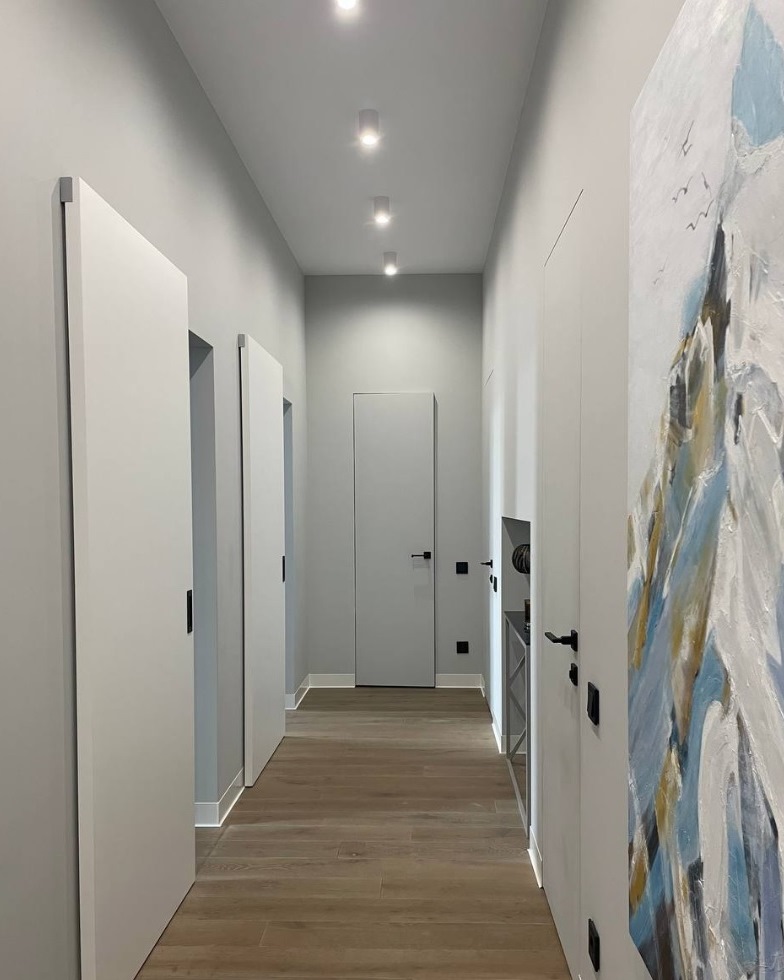 Наилучшим образом в интерьер вписались очень популярные двери нашей фабрики - Porte из коллекции Techno. Несколько дверей смонтировали в скрытом коробе и покрыли эмалью в цвет стен. Другие установили на откатную систему открывания INVISIBLE и оставили белыми. Кстати, очень стильно смотрятся контрастные черные ручки.