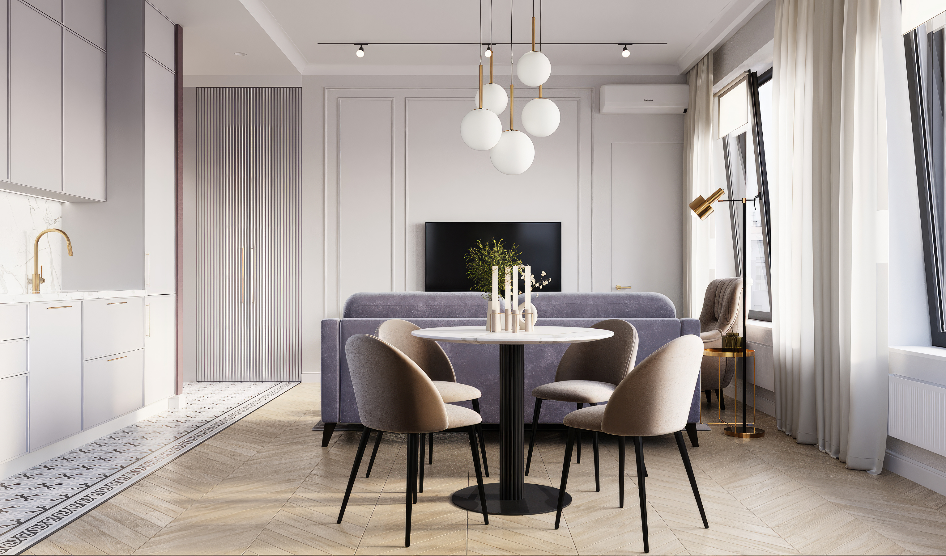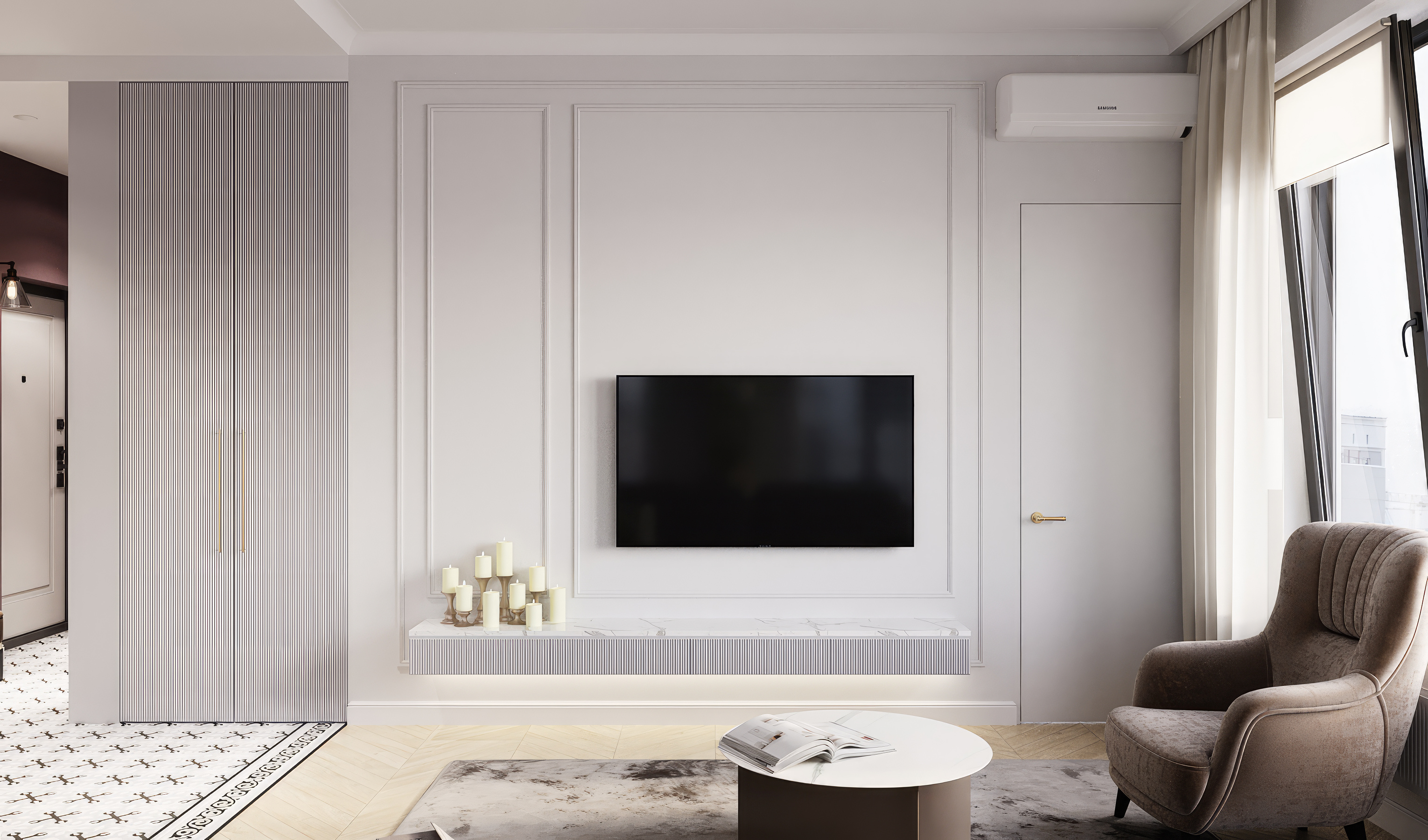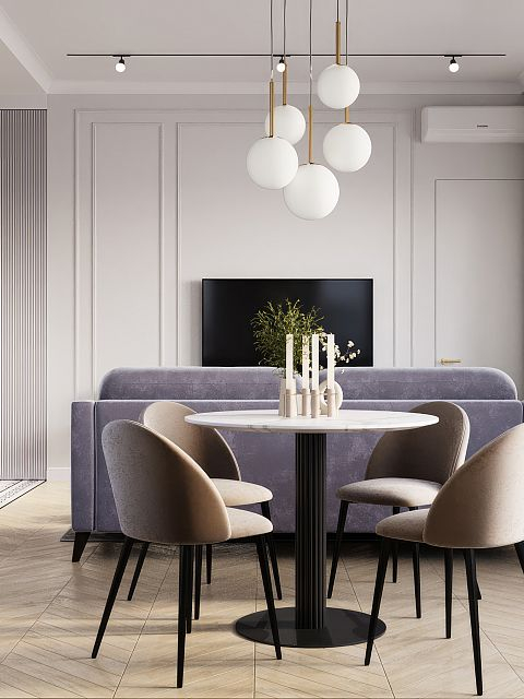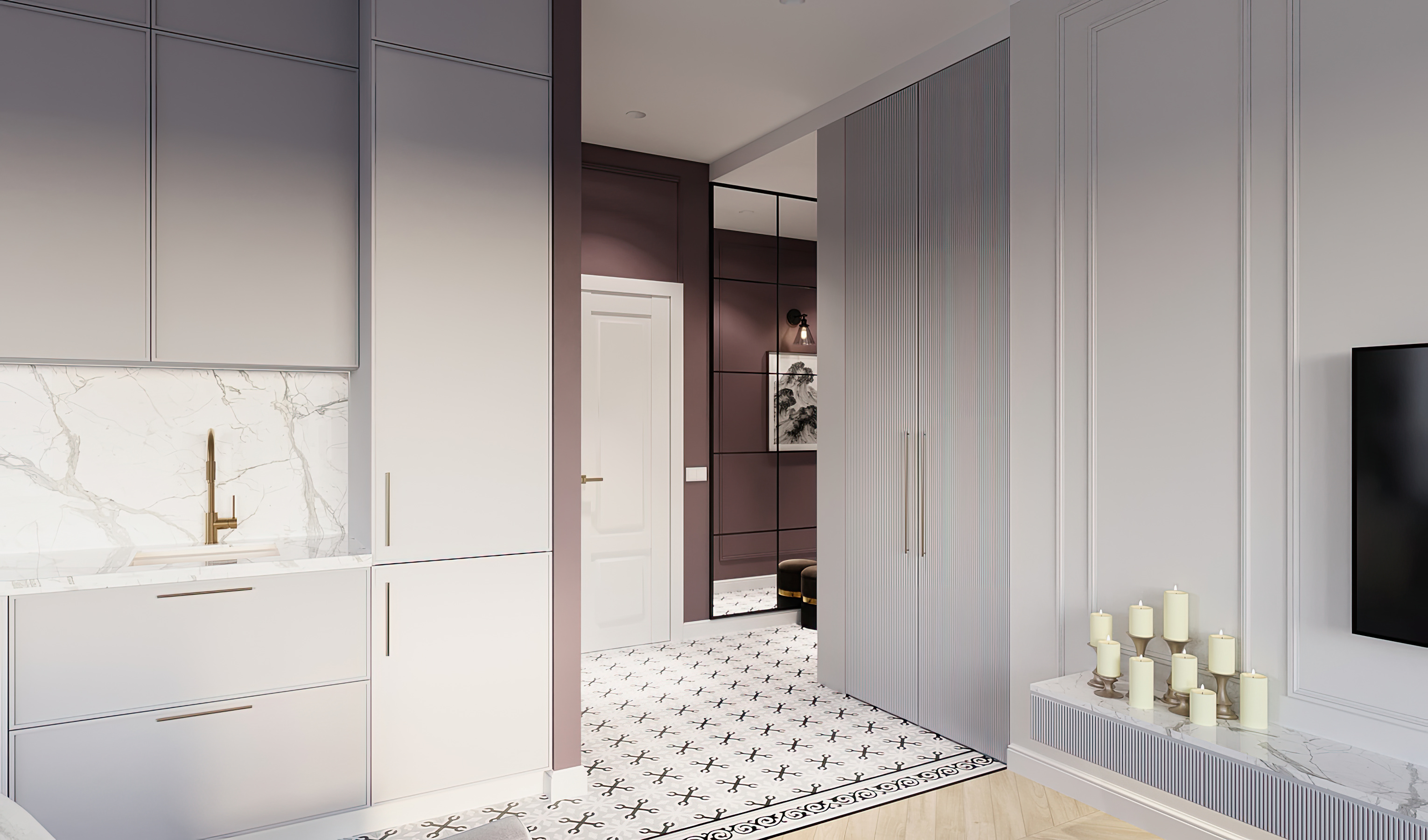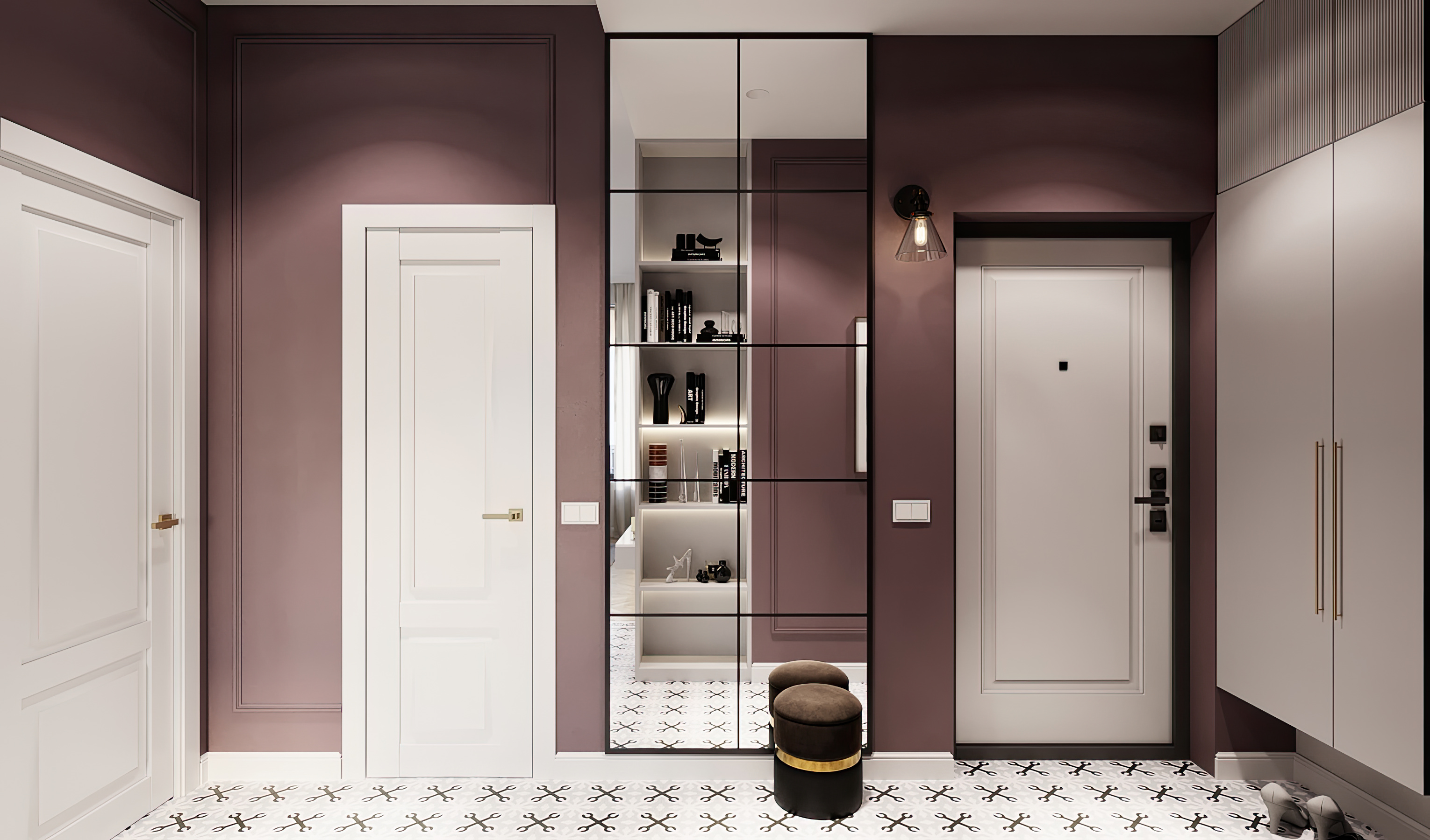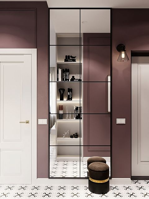 Обустроить современную квартиру, чтобы было не только красиво, уютно, но и функционально, и эргономично задача не совсем простая. Но автору это удалось. Здесь все продумано до мелочей, чтобы владельцы могли спокойно жить, принимать гостей, отдыхать и просто приятно проводить время и в качестве вишенки на торте была выбрана акцентная цветовая гамма цвета спелой сливы, чтобы жизнь в новом интерьере была максимально сладкой и вкусной. Белые двери подчеркивают яркий оттенок стены и немного его уравновешивают. В гостиной использована скрытая дверь в алюминиевом коробе, она словно сливается со стеной, образуя единую ровную поверхность.