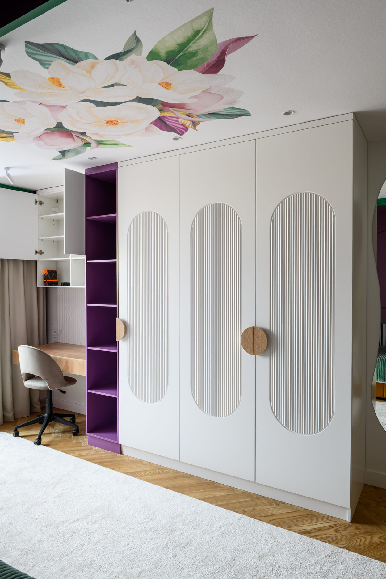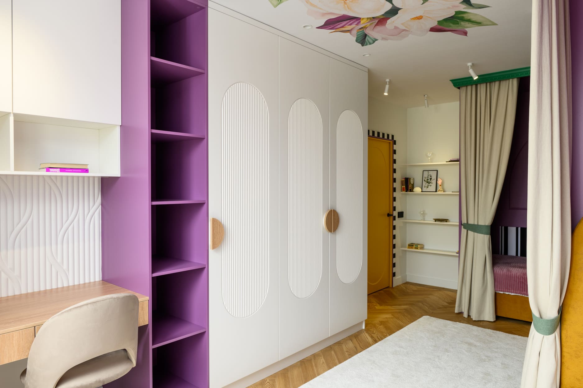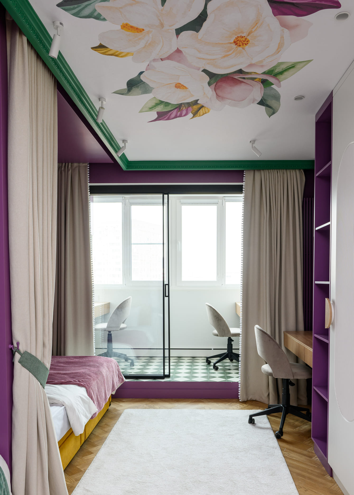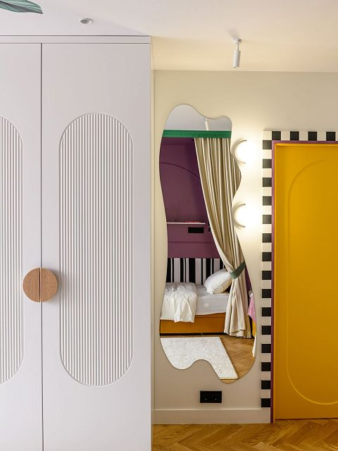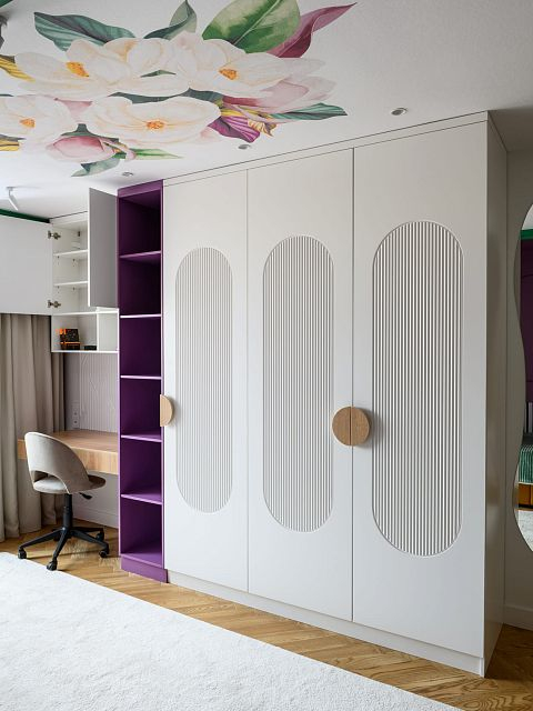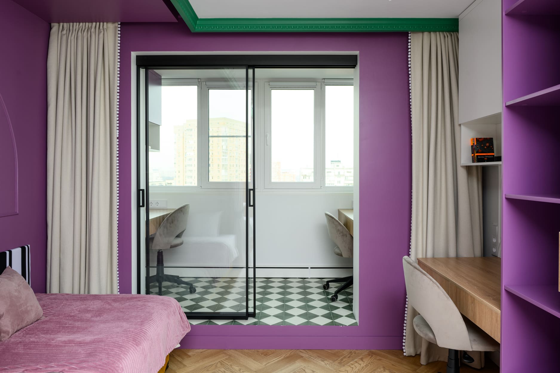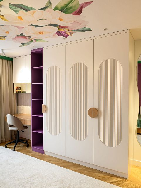 В этом проекте было принято смелое решение: вместо трех отдельных кроватей в детской были созданы три отдельные комнаты, где каждая из сестер сможет найти уединение. Был убран оконно-балконный блок, что позволило получить 23 квадратных метра вместе с лоджией. Простенок между пространствами был демонтирован, а получившийся проем немного уменьшили.