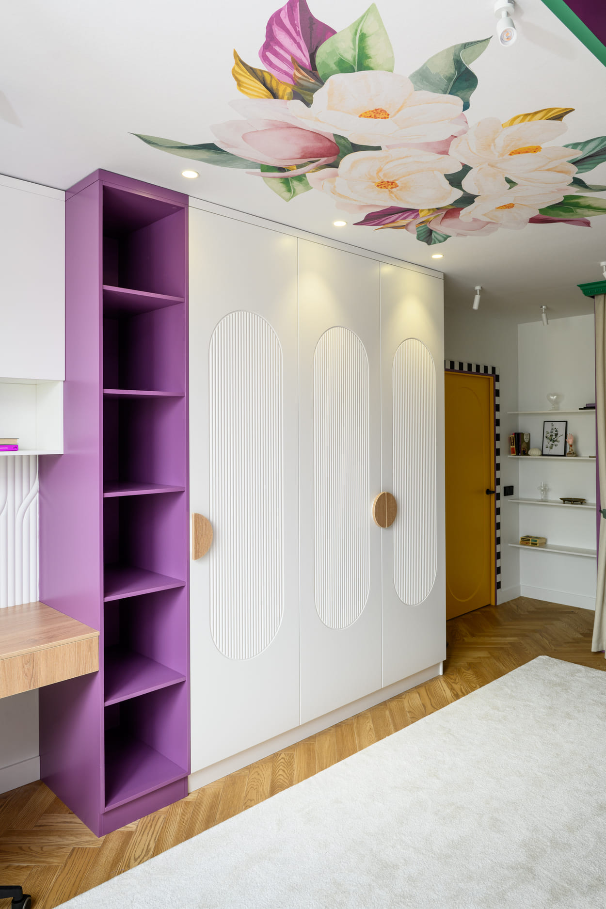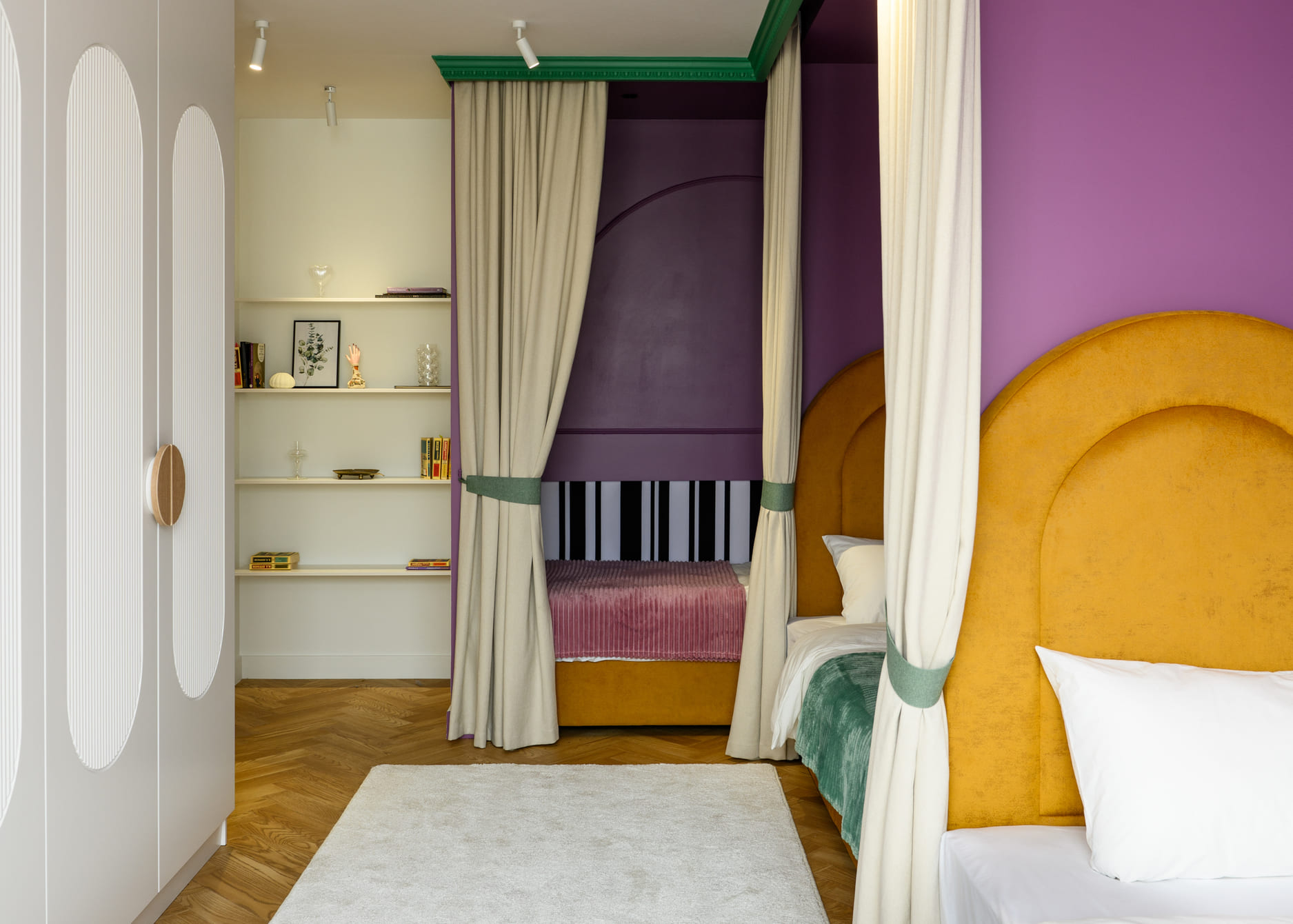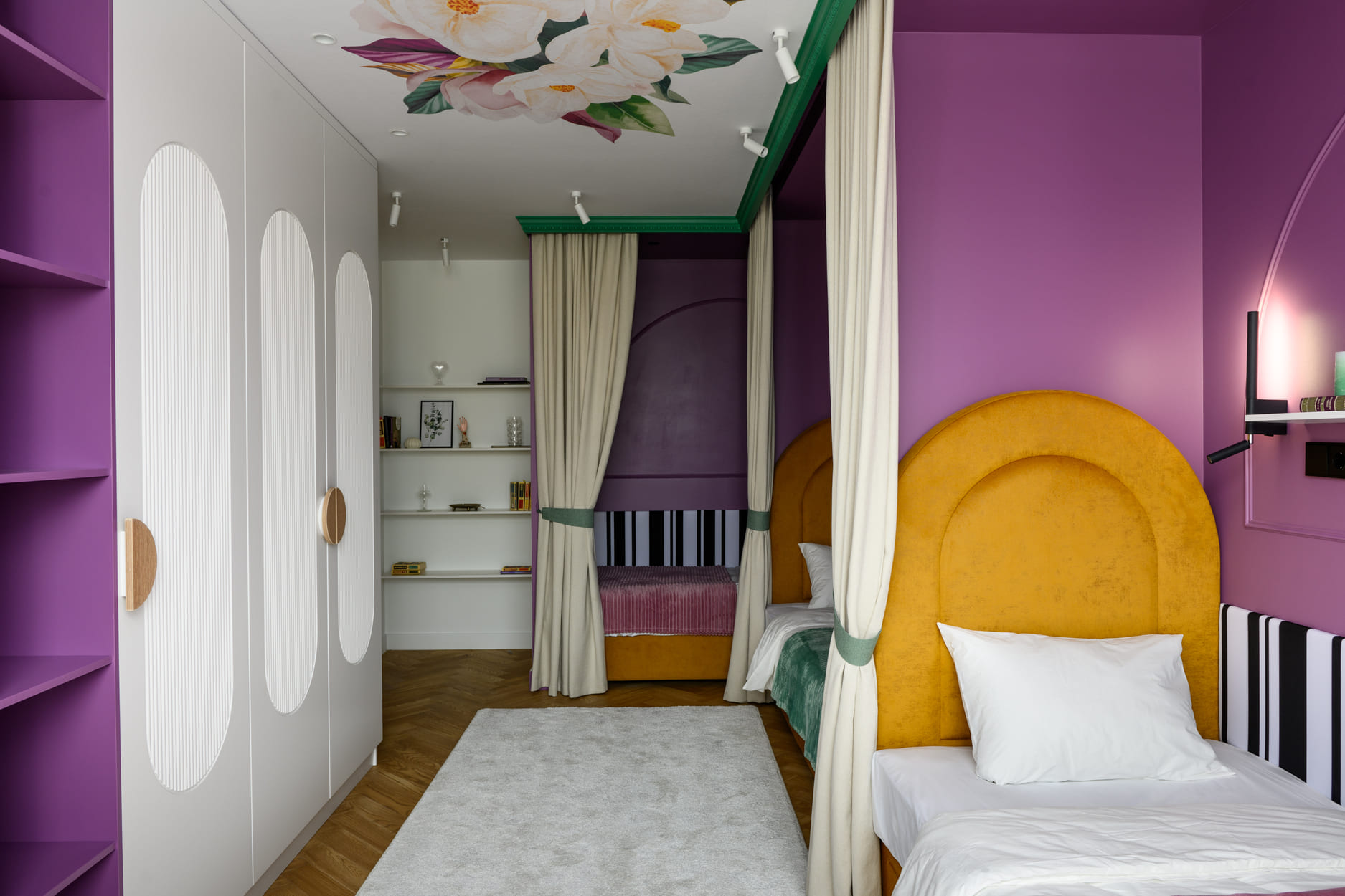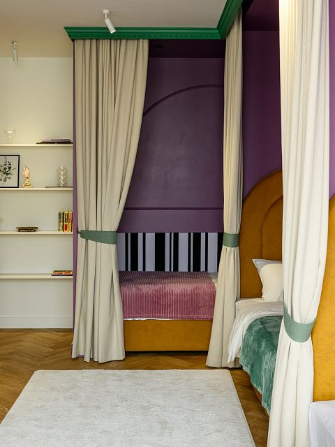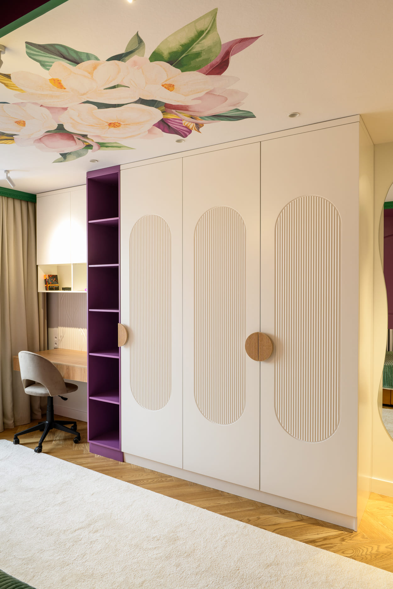 В этом проекте было принято смелое решение: вместо трех отдельных кроватей в детской были созданы три отдельные комнаты, где каждая из сестер сможет найти уединение. Был убран оконно-балконный блок, что позволило получить 23 квадратных метра вместе с лоджией. Простенок между пространствами был демонтирован, а получившийся проем немного уменьшили.
