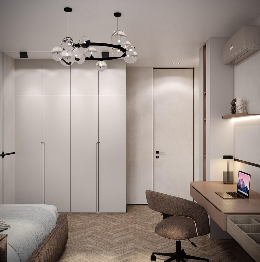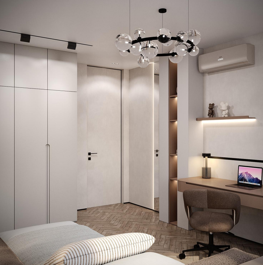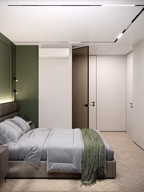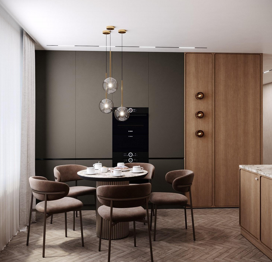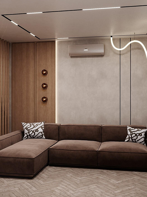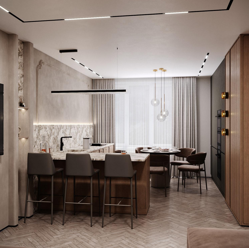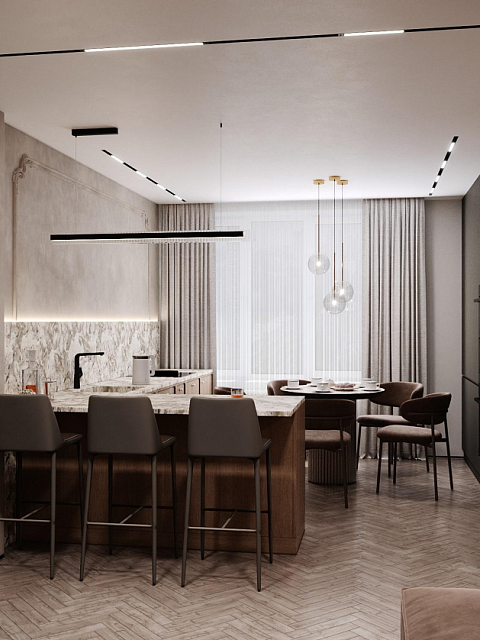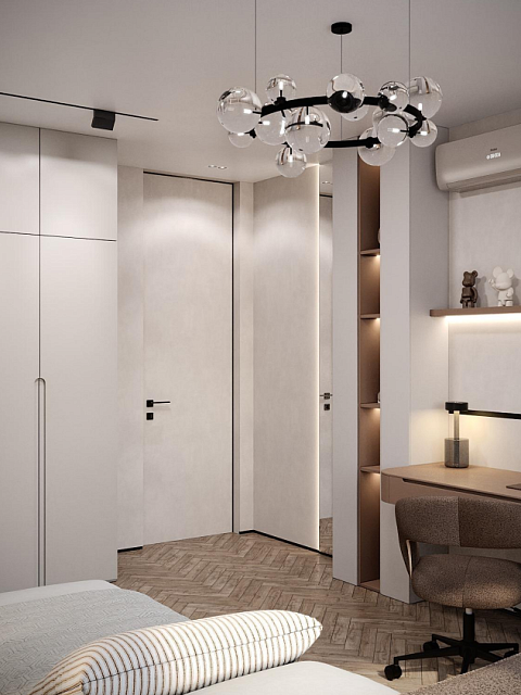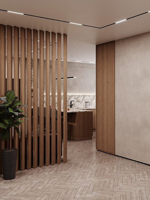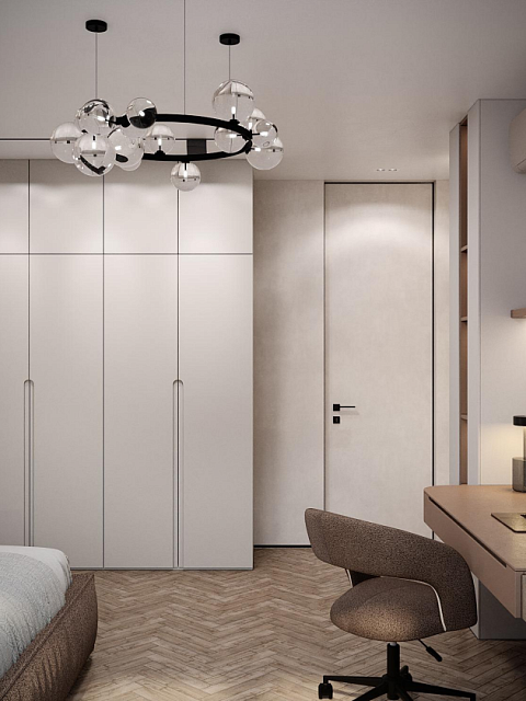 Этот стильный дизайн-проект выполнен в эстетике современного минимализма с использованием теплой бежево-коричневой палитры и натуральных фактур дерева и камня. Ключевым элементом, формирующим архитектурную чистоту пространства, стали межкомнатные двери скрытого монтажа из коллекции Secret от фабрики «Терем». Благодаря установке в одной плоскости со стеной и отсутствию наличников, эти двери идеально вписываются в концепцию «бесшовного» интерьера, визуально расширяя помещения. Такое решение позволяет не отвлекать внимание от декоративных деталей — реечных перегородок, мрамора на кухне и стильной подсветки. Использование дверей фабрики «Терем» подчеркивает высокий статус интерьера и помогает сохранить единство стиля во всей квартире, от прихожей до спальни. В результате пространство выглядит цельным, воздушным и технически безупречным.