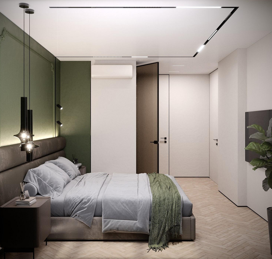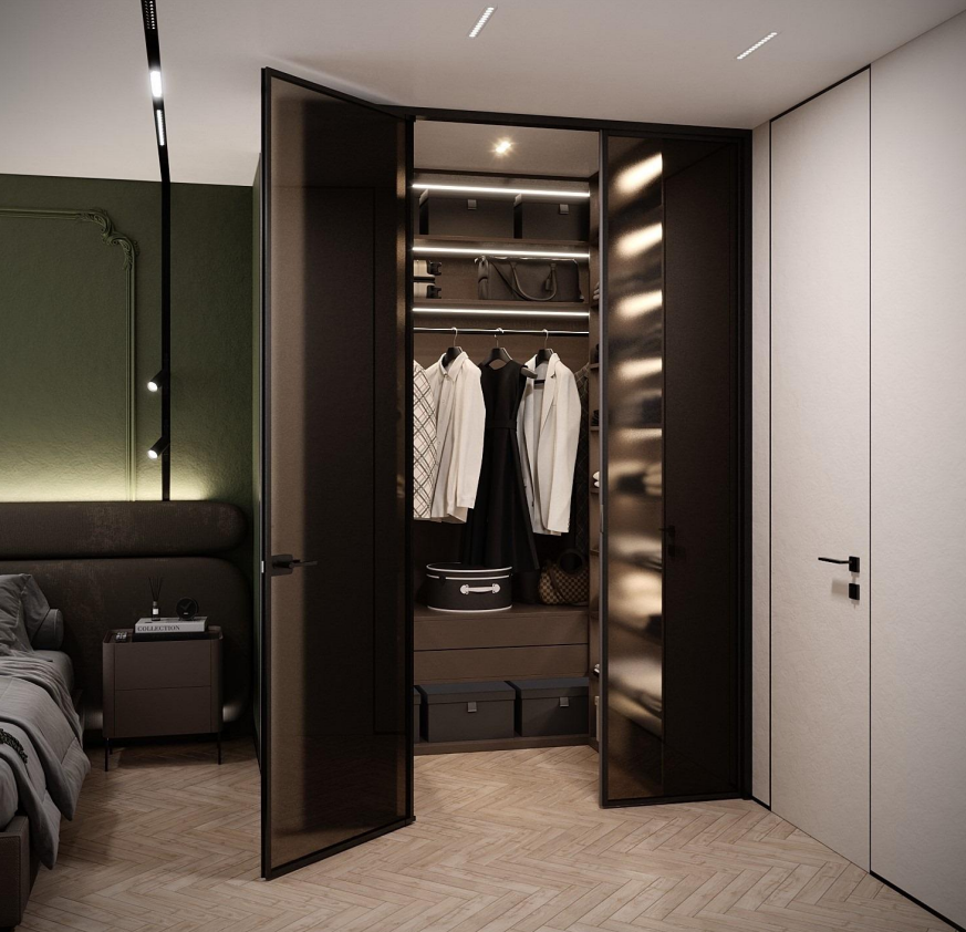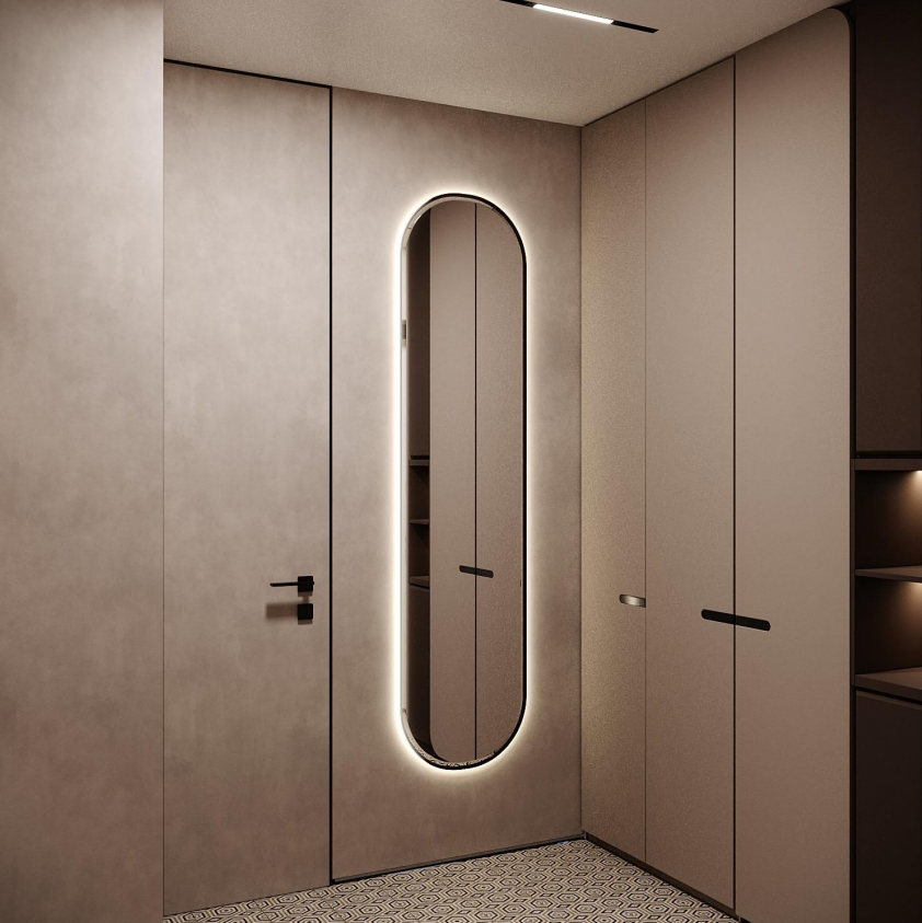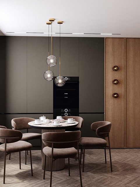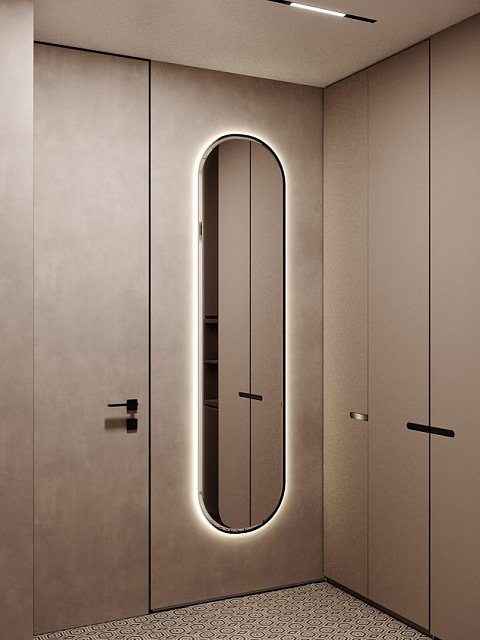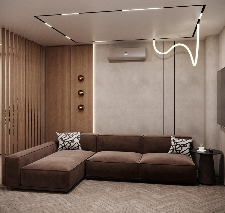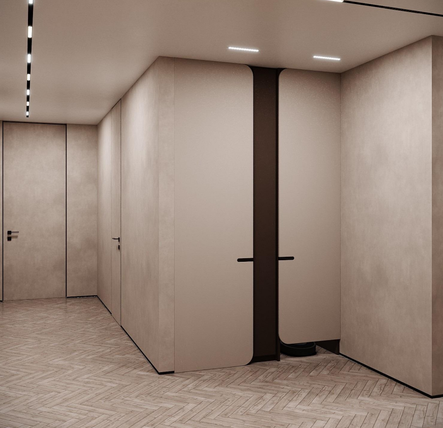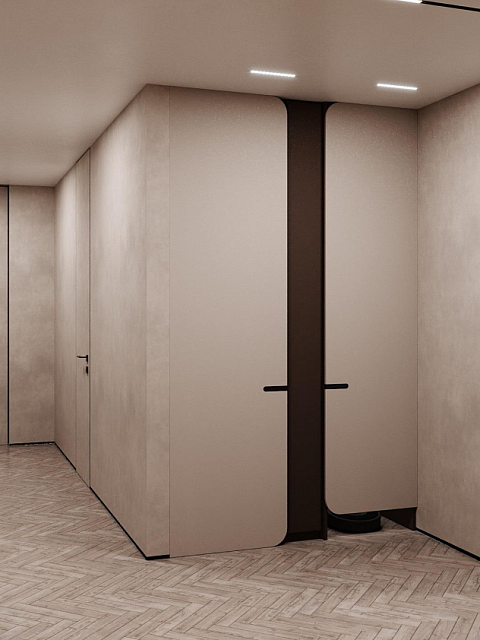 Этот стильный дизайн-проект выполнен в эстетике современного минимализма с использованием теплой бежево-коричневой палитры и натуральных фактур дерева и камня. Ключевым элементом, формирующим архитектурную чистоту пространства, стали межкомнатные двери скрытого монтажа из коллекции Secret от фабрики «Терем». Благодаря установке в одной плоскости со стеной и отсутствию наличников, эти двери идеально вписываются в концепцию «бесшовного» интерьера, визуально расширяя помещения. Такое решение позволяет не отвлекать внимание от декоративных деталей — реечных перегородок, мрамора на кухне и стильной подсветки. Использование дверей фабрики «Терем» подчеркивает высокий статус интерьера и помогает сохранить единство стиля во всей квартире, от прихожей до спальни. В результате пространство выглядит цельным, воздушным и технически безупречным.