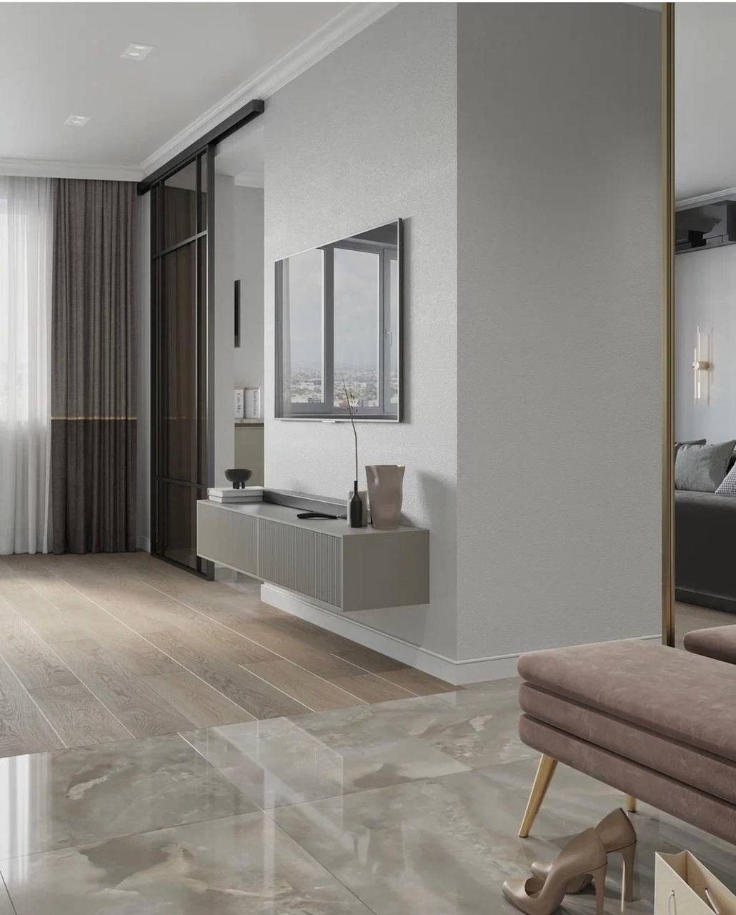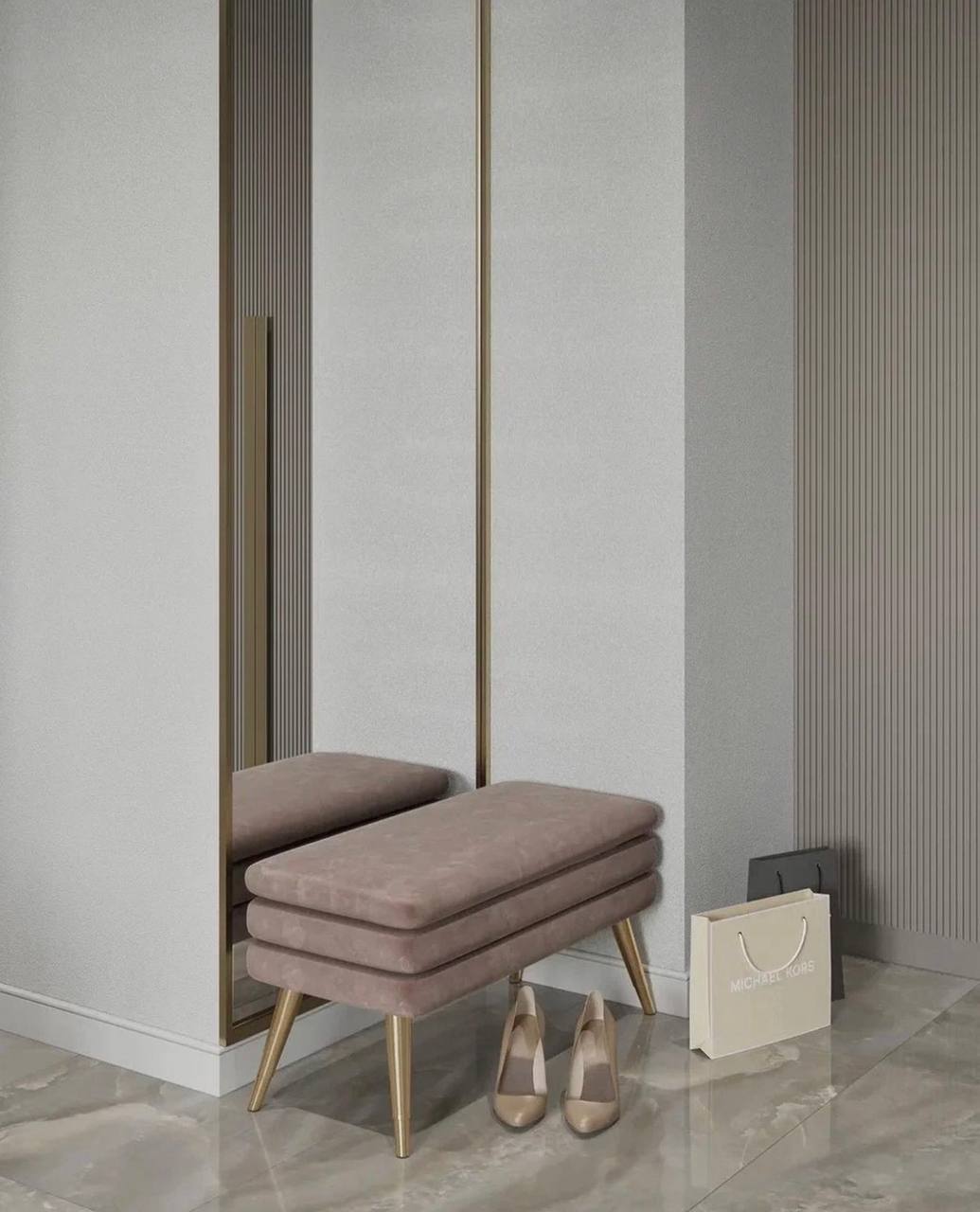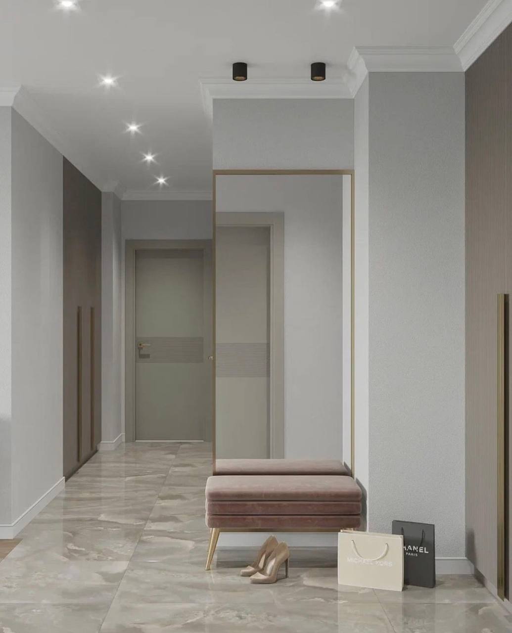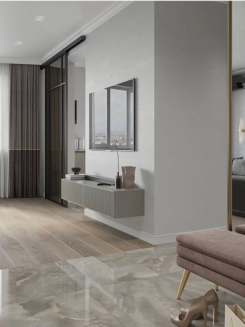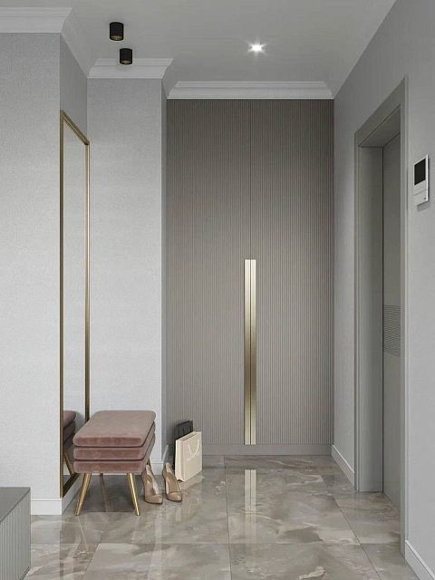 Для проекта была выбрана сдержанная цветовая гамма в серых благородных тонах, присутствуют трендовые рифленые поверхности. Рисунок с бороздками на межкомнатных дверях Mezzo в эмали гармонично перекликается с фасадами шкафов, тумб. Вся композиция выглядит целостной. Акцента и лоска добавляют латунные детали в виде фурнитуры, молдингов на стенах и ножек у мебели.