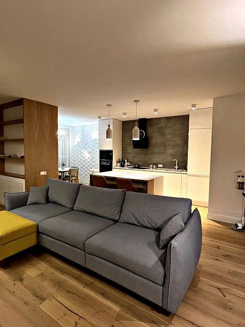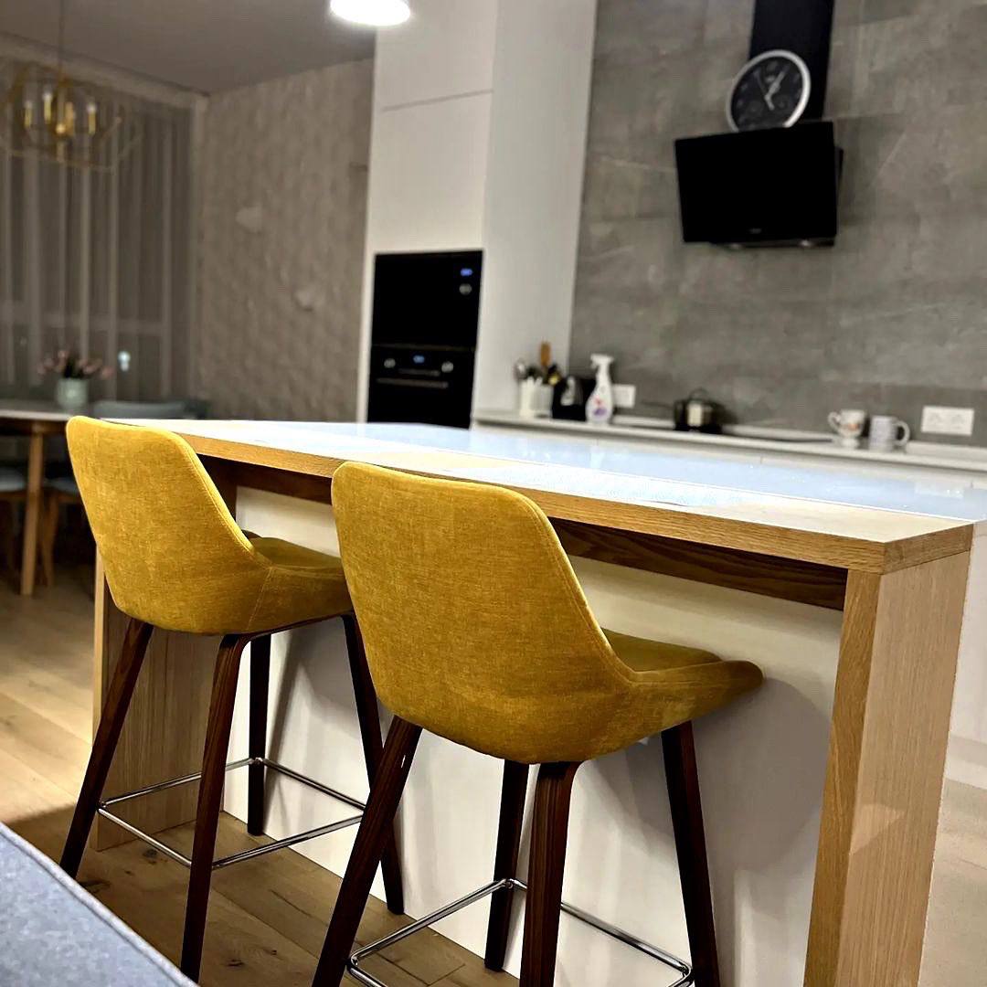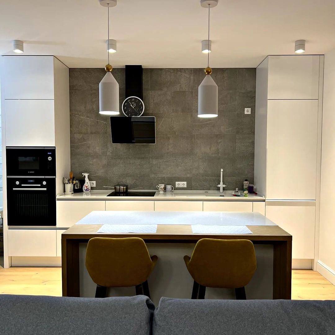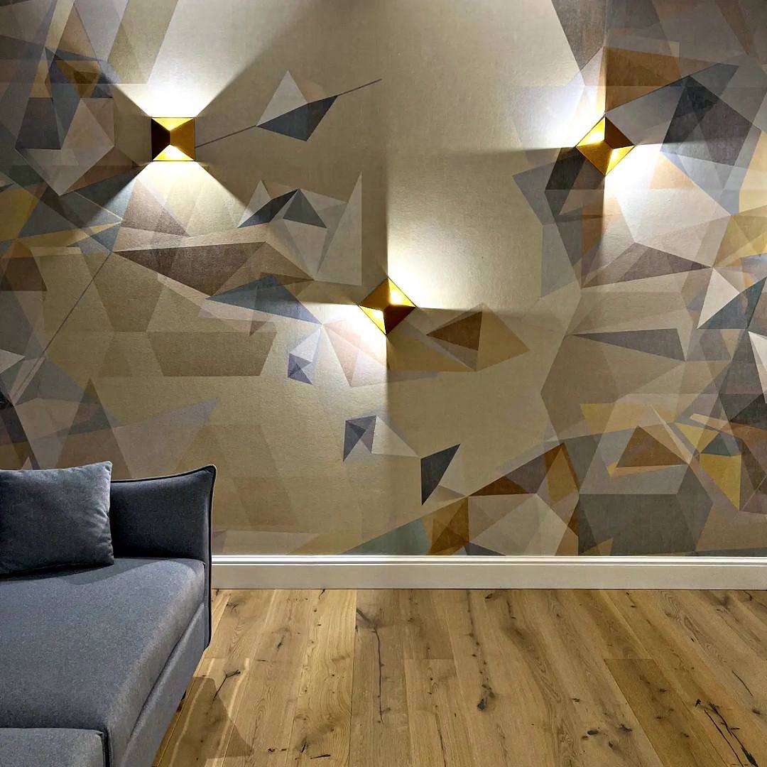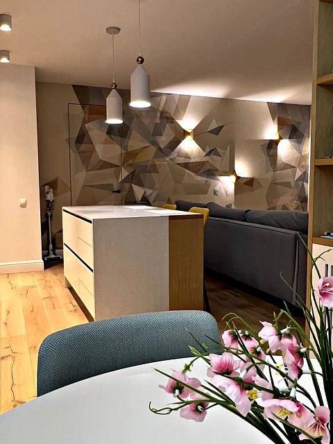 Своему новому проекту дизайнер Ирина Алексеева (г.Уфа) придала выразительности в первую очередь за счет яркой стены с геометрическим рисунком и стильных светильников в монохромной отделке. Использование дверей скрытого монтажа от фабрики Terem позволило сделать акцент на интересные дизайнерские задумки, а пространство более легким и графичным.