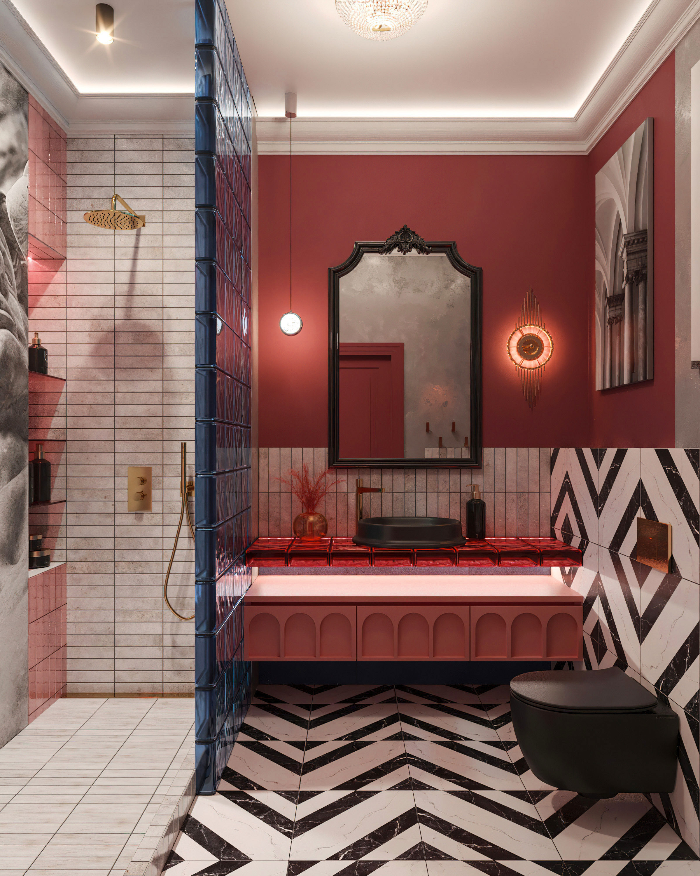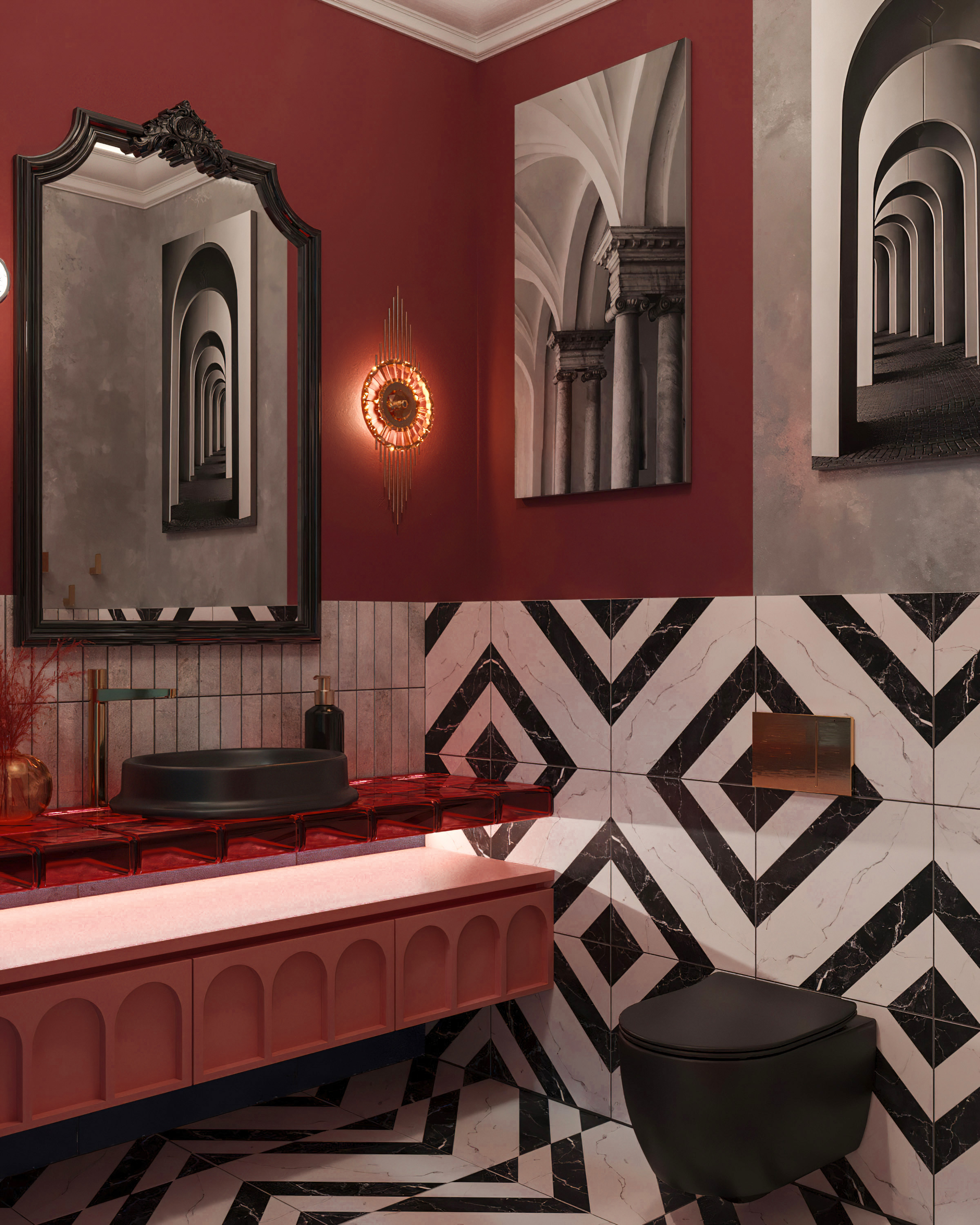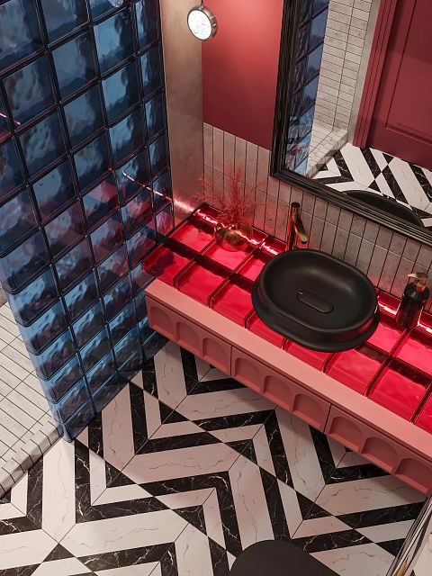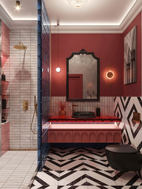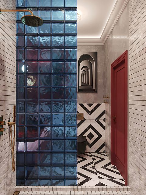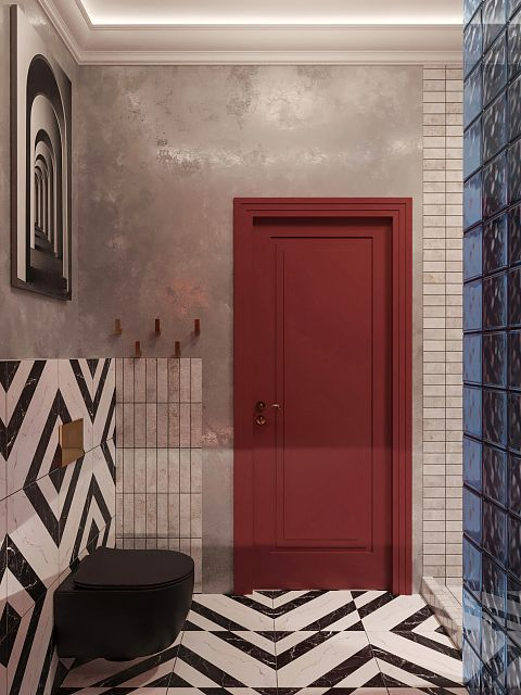 Санузел продолжает концепцию прихожей, делая акцент на оригинальные и нестандартные решения. Здесь можно увидеть смелые сочетания текстур, например, глянцевые и матовые поверхности, которые создают эффектный визуальный контраст. Зонирование пространства осуществляется с помощью оригинальных элементов декора, которые не только придают уникальность, но и делают функциональность максимально удобной.