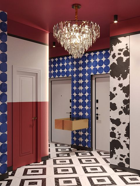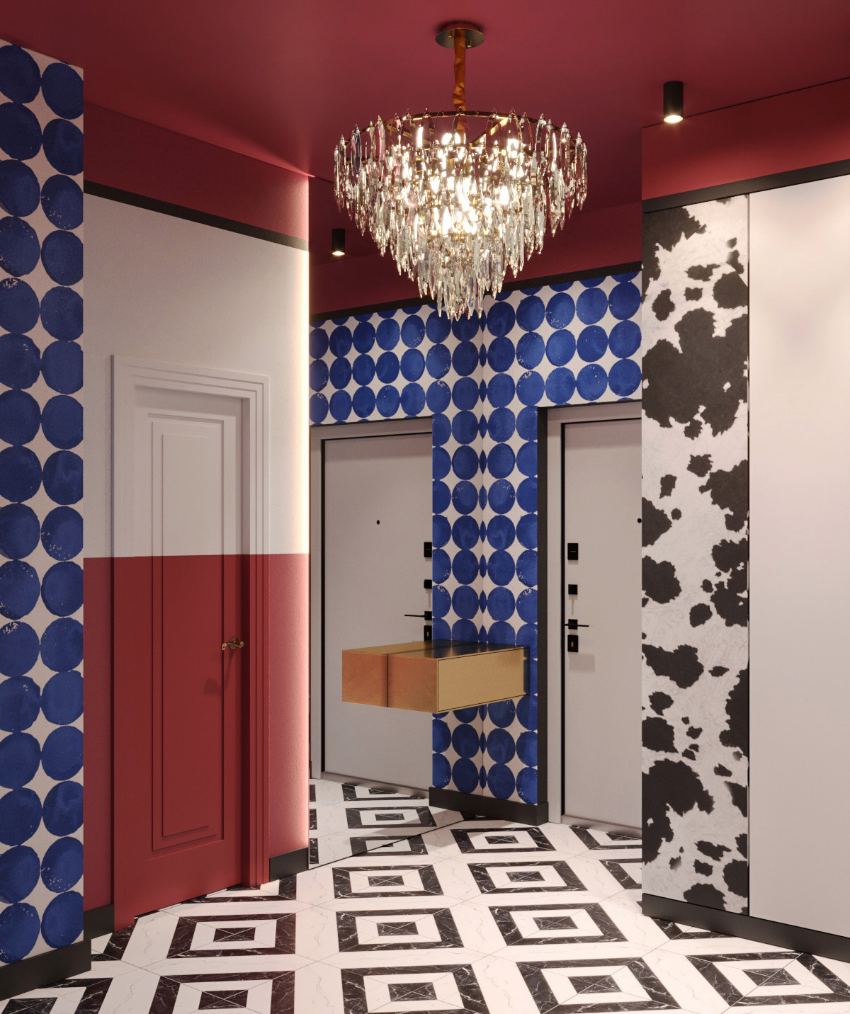 Входная зона встречает гостей насыщенной бардовой палитрой, которая создает чувство уюта и тепла. Яркие акценты синего цвета используются в декоре, добавляя интерьеру нотки современности и креативности.