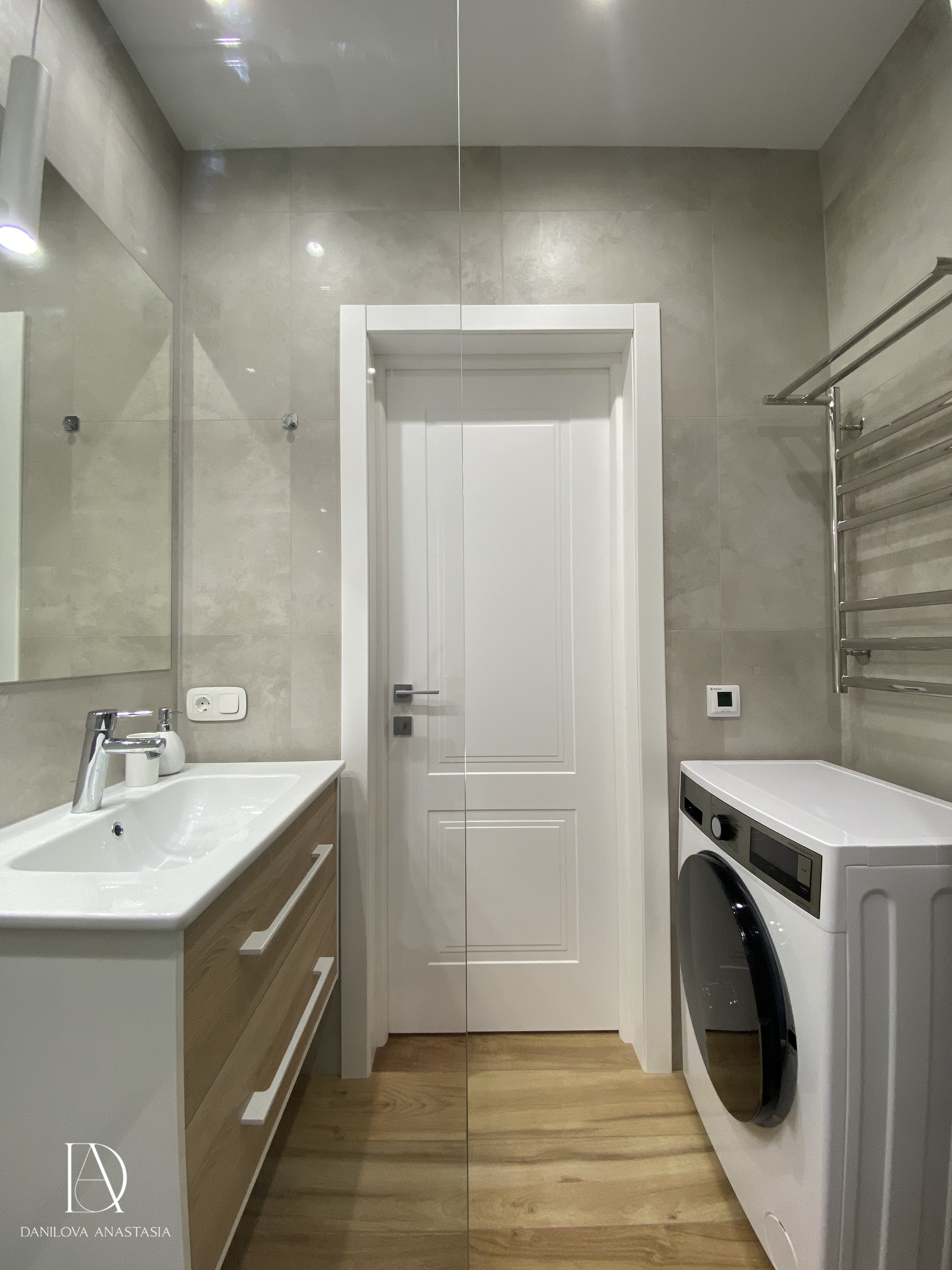 Для всей квартиры мы выбрали межкомнатную дверь модель Rino 2 в белой лаконичной эмали, с приятными тактильными свойствами. Дизайн модели очень красивый, сочетает в себе лёгкость фрезеровки, современность и классику. Дверь подчеркивает современный стиль интерьера и добавляет белые детали в пространство.