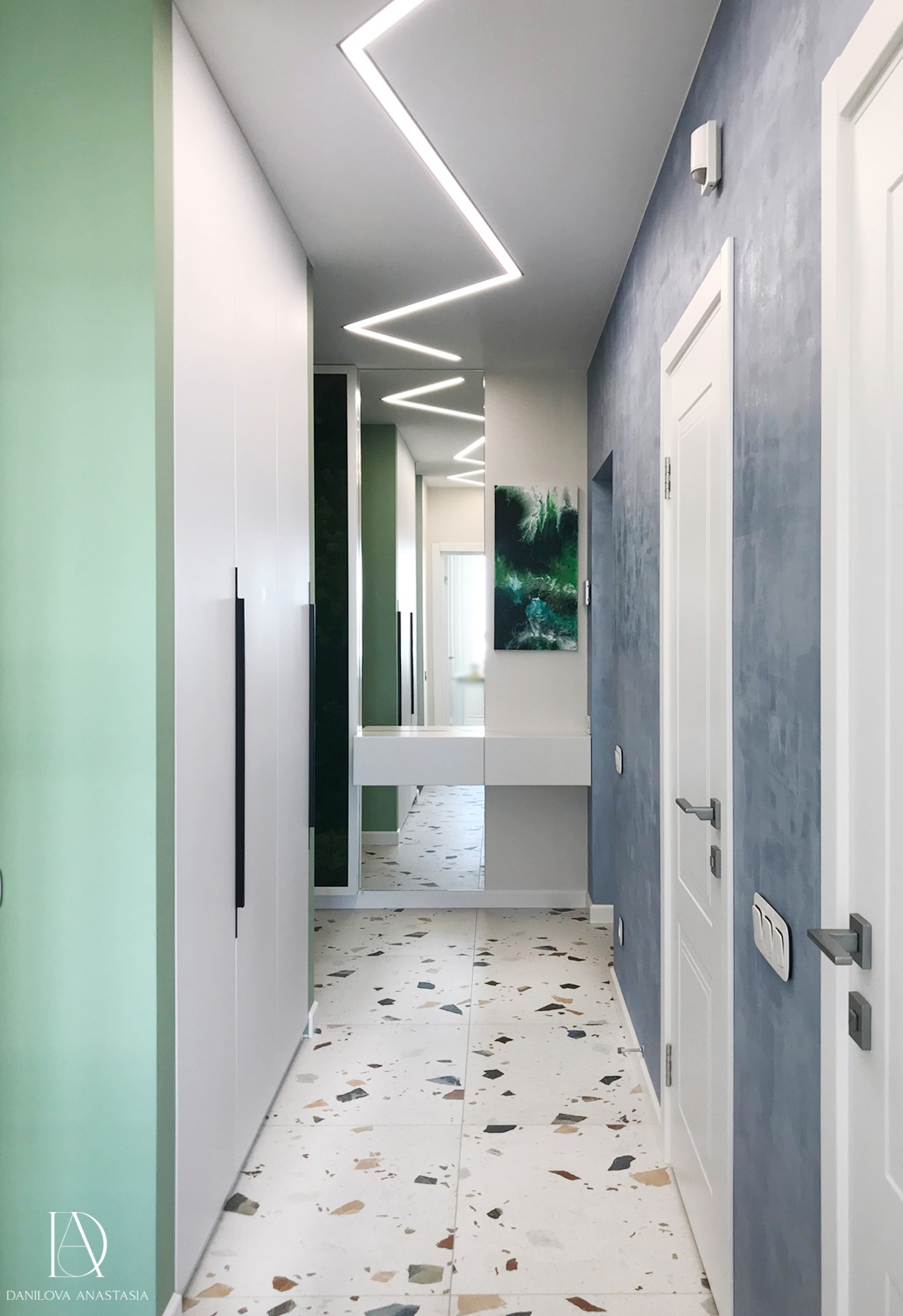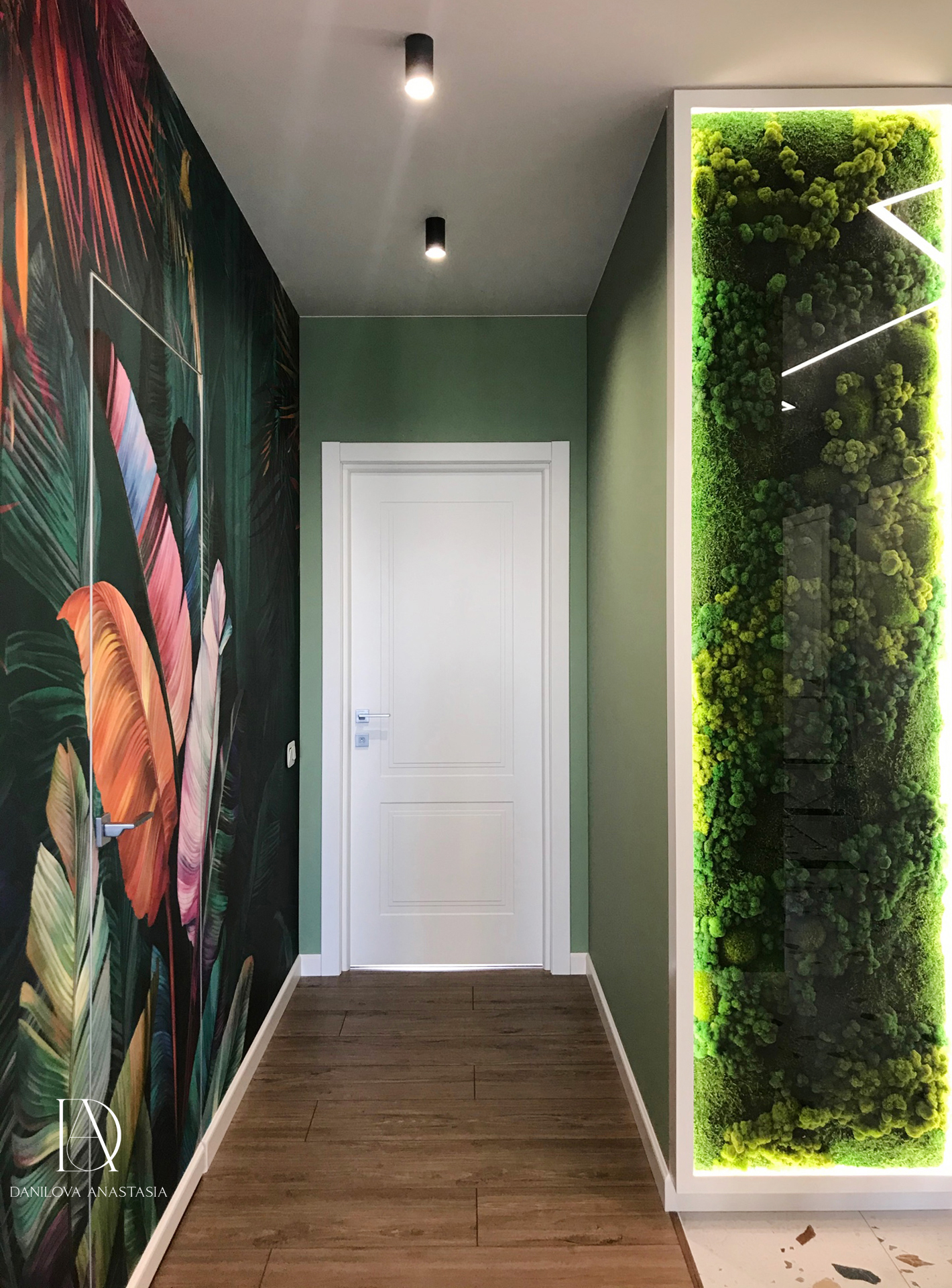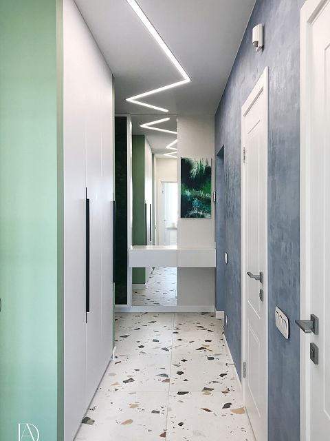 Также в проекте мы использовали скрытую дверь, чтобы сделать акцентную фреску в интерьере при входе и скрыть гардеробную комнату. Дверь взяли с алюминиевой кромкой, чтобы максимально плотно прийти к нему фреской и не задевать фреску во время эксплуатации. Со стороны гардеробной дверь покрасили.