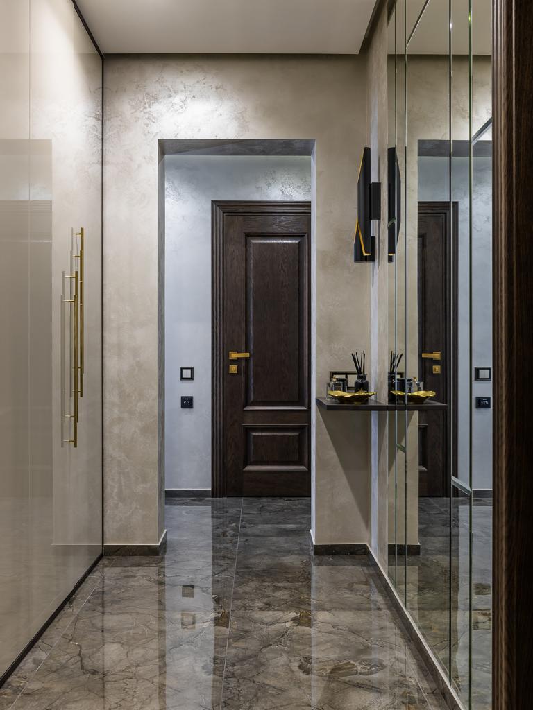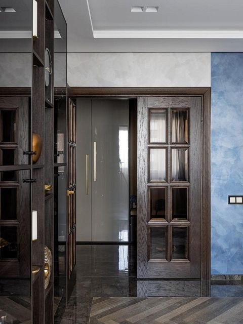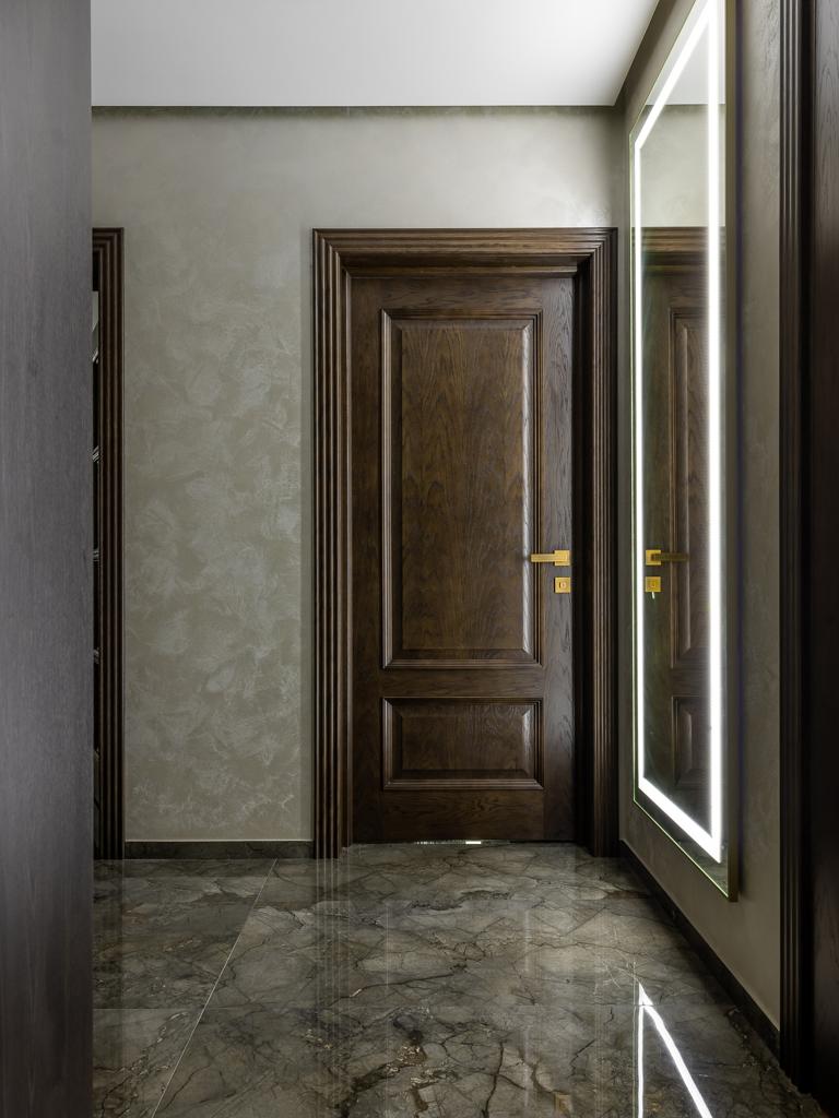 Глубина покрытия шпона достигается за счет поэтапного нанесения материалов. Сначала шпон тонируется в темный цвет, после высыхания основы двери покрываются более светлыми тонами эмали и лака. Полученный эффект вы можете увидеть на фото проекта.