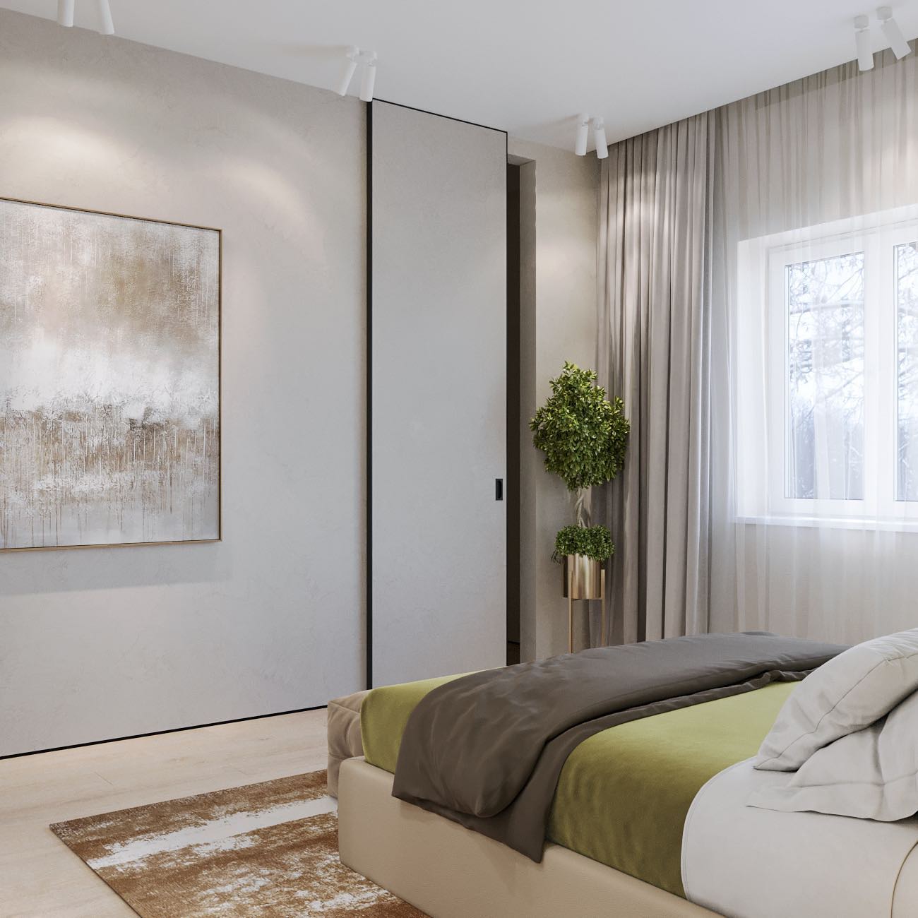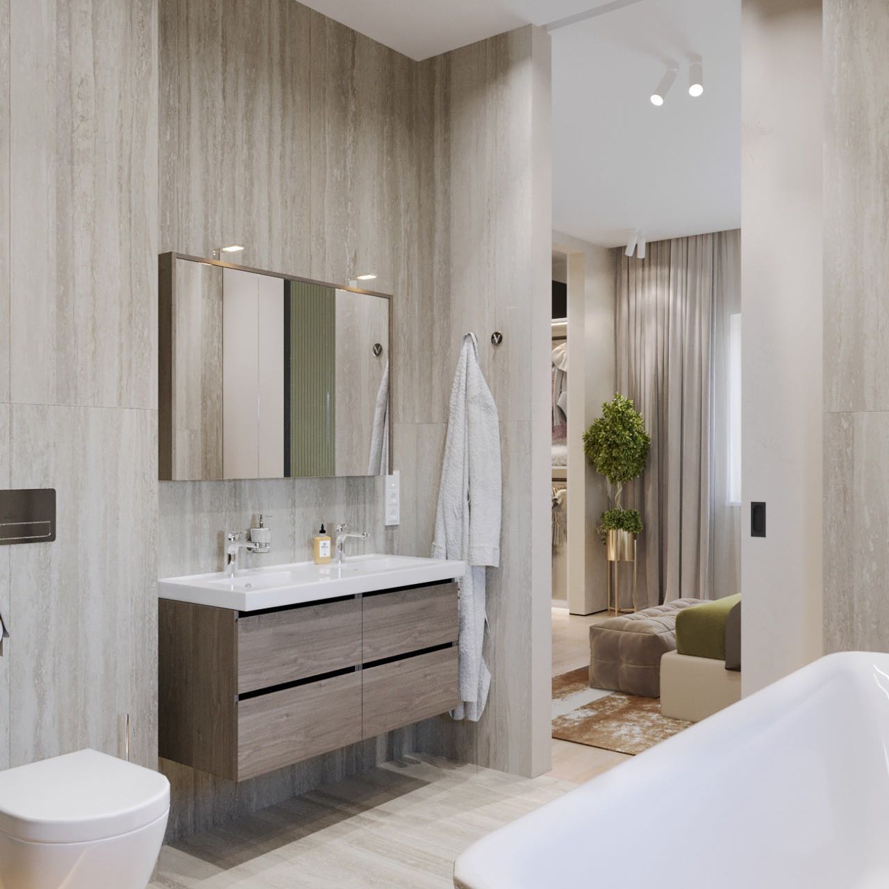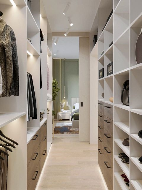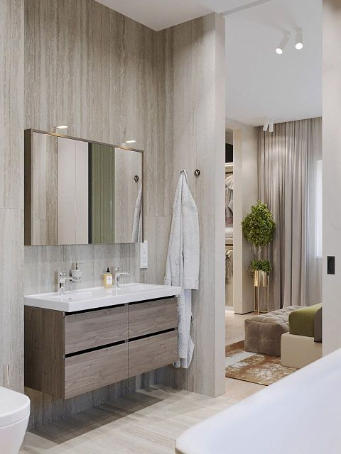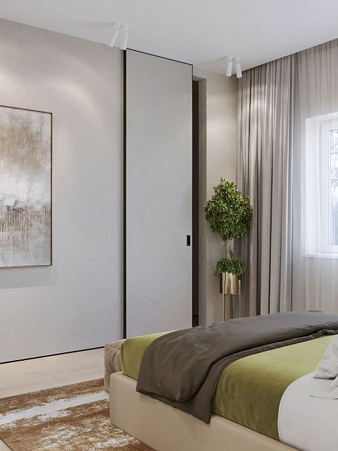 Вместе с тем, вся обстановка максимально продумана и функциональна: входы в гардеробную и санузлы скрыты от посторонних глаз дверями, смонтированными при помощи невидимого механизма открывания INVISIBLE или в скрытом алюминиевом коробе и окрашенными в цвет стен. А нотки трендовости интерьеру добавляют модные высокие двери в покрытии натуральный шпон дуба, цвет «Мускат».
