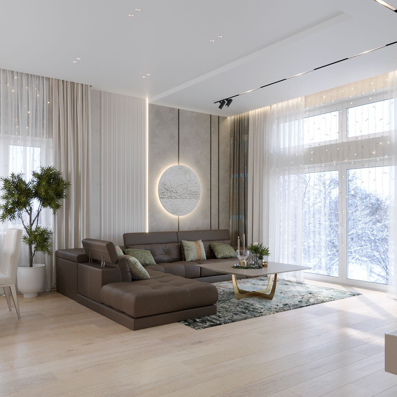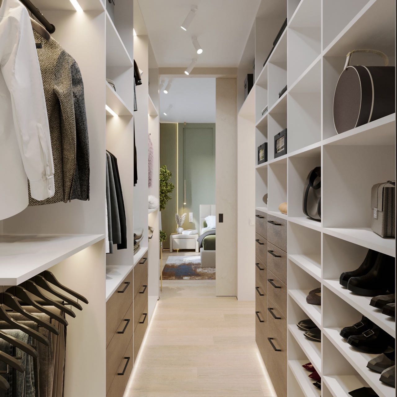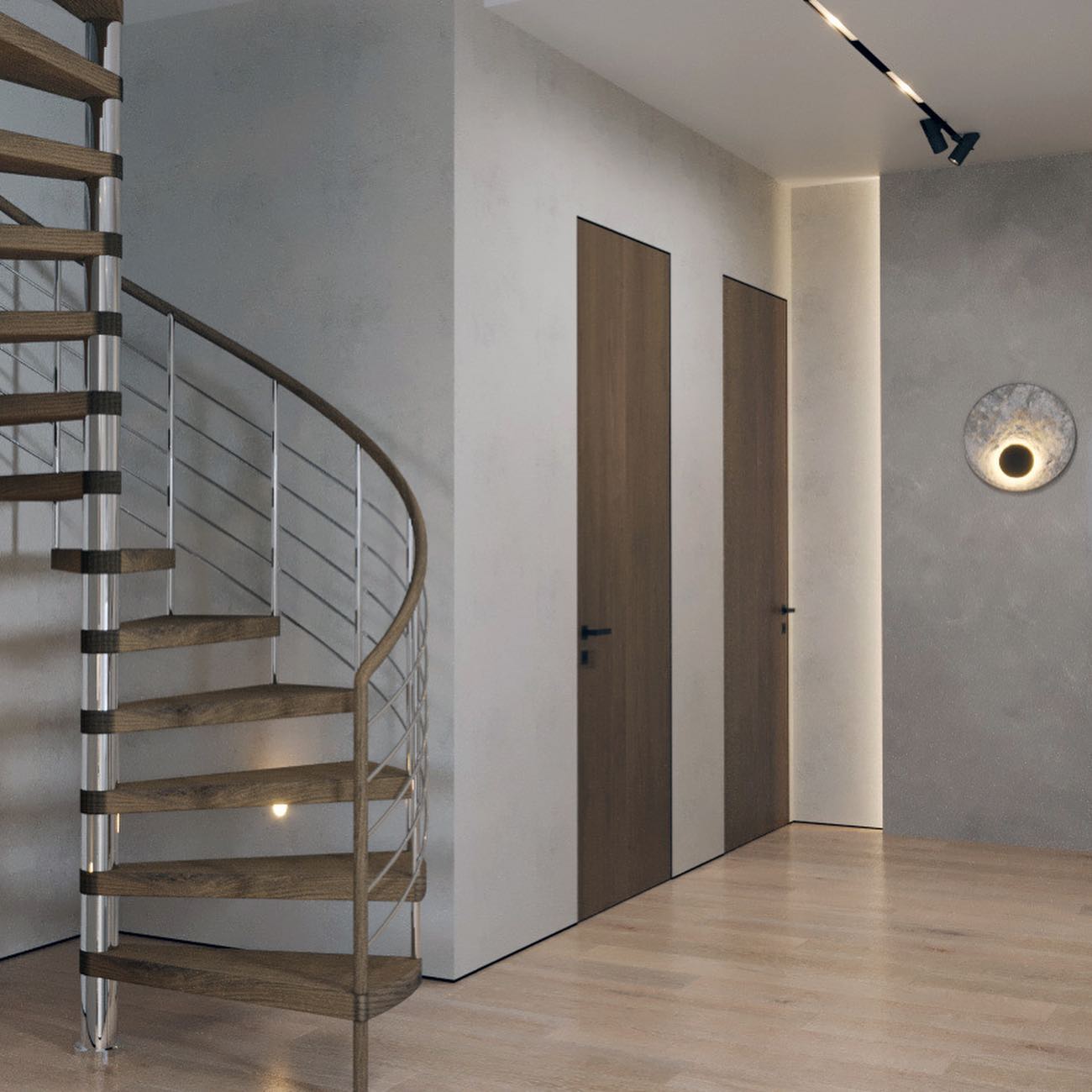 Вместе с тем, вся обстановка максимально продумана и функциональна: входы в гардеробную и санузлы скрыты от посторонних глаз дверями, смонтированными при помощи невидимого механизма открывания INVISIBLE или в скрытом алюминиевом коробе и окрашенными в цвет стен. А нотки трендовости интерьеру добавляют модные высокие двери в покрытии натуральный шпон дуба, цвет «Мускат».