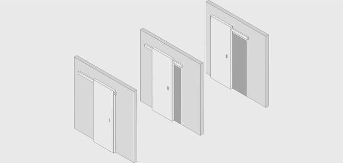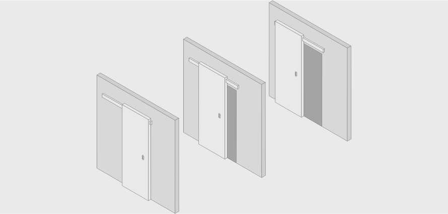 Дверь скользит вдоль стены по направляющей, которая может быть выполнена в двух цветах: черный или алюминиевый. Возможно исполнение с доводчиком или без.