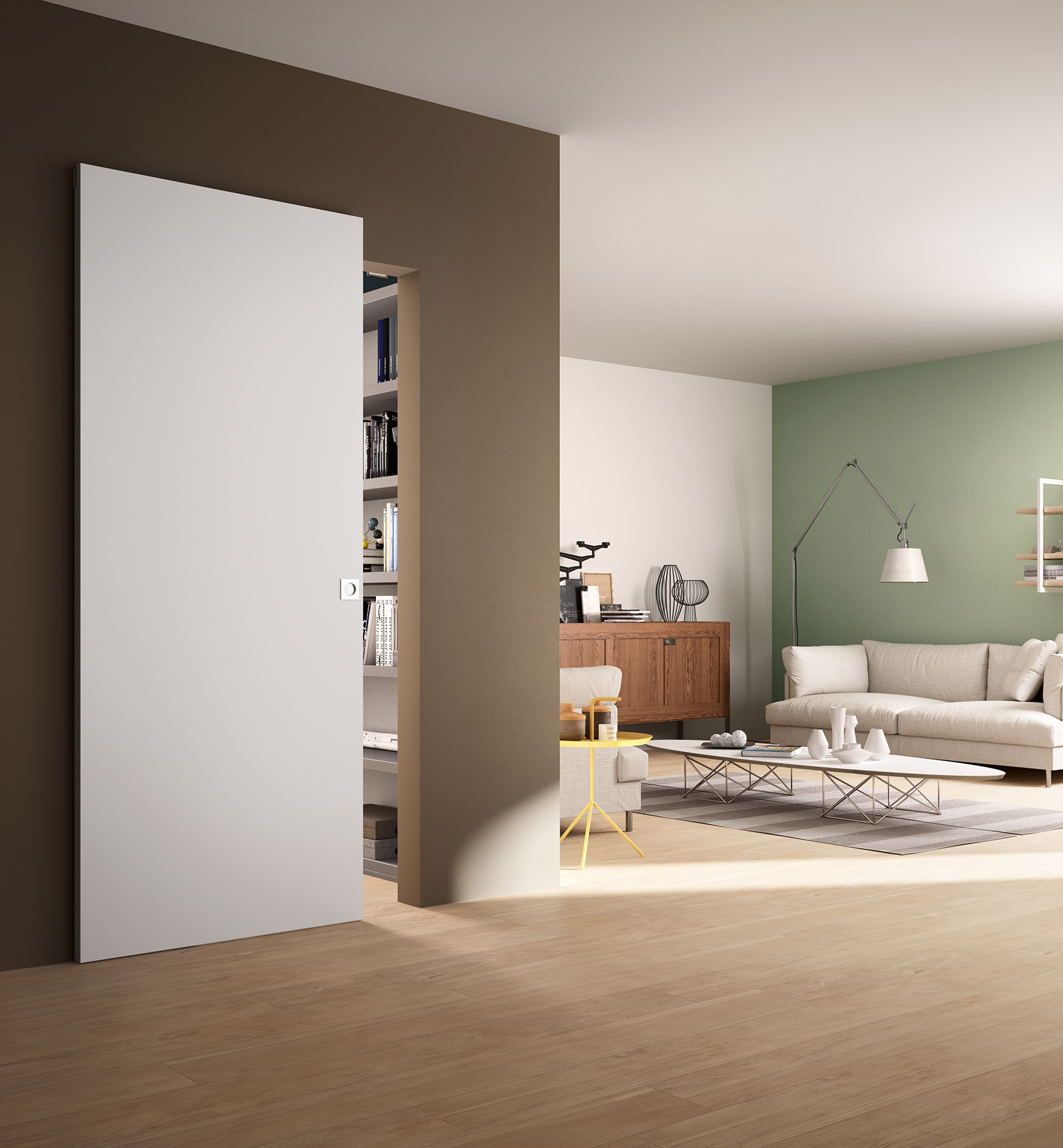 Раздвижной механизм INVISIBLE имеет компактные размеры, поэтому может быть установлен в любой комнате. Однако наиболее эффектно дверь с такой системой смотрится в просторных комнатах, где открывается широкий дверной проем, рядом с которым можно установить любую мебель.