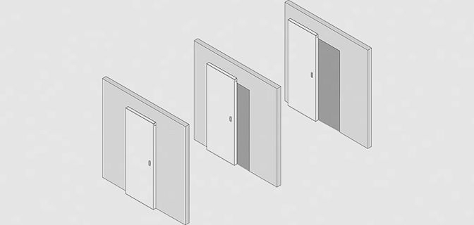 Дверь скользит вдоль стены по направляющим, механизм полностью невидим, поскольку скрыт за дверным полотном.